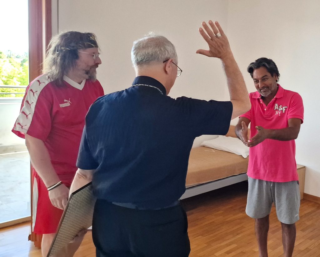 La seconda tappa è stata casa “San Giuseppe”, struttura di proprietà della diocesi, a Martorano. Qui vivono sei uomini, alcuni con problemi di salute, provenienti da Marocco, Tunisia, Nigeria, Bangladesh. A un marocchino il vescovo ha detto, scherzando: “Sono calabrese. Siamo vicini di casa. In Calabria ci sono molti nuclei dal nord Africa e vivono tutti integrati”. La struttura è di seconda accoglienza. Vi sono sette mini camere con bagno e angolo cottura, una sala comune al piano terra e una lavatrice comune. “Qui gli ospiti godono di privacy e tranquillità – spiega Andrea Casadei -. È un’opportunità unica per ripartire. Di recente, sono state apportate anche delle migliorie come mobilio, tv e servizi”.