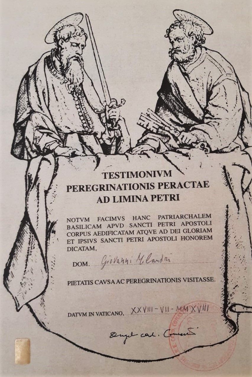 Con oltre 50 tappe di cammino, Giovanni “Vanni” Milandri, camminatore cesenate, iscritto al Cai, 71 anni, ha compiuto un altro dei suoi lunghissimi pellegrinaggi e mostra orgoglioso il “Testimonium” rilasciato presso la basilica di San Pietro (foto sotto). Segue così di qualche giorno l’arrivo a Roma di un’altra cesenate, la mamma-poliziotta Arianna Amadori, partita direttamente da Cesena lungo il Cammino di San Vicinio e la via Romea Germanica.