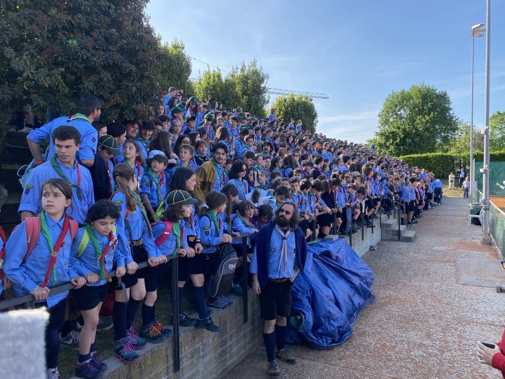 Una distesa di camicie azzurre. E di fazzolettoni. È gremito il Club ippodromo. Sono almeno 1500 le presenze tra scout e familiari, oggi pomeriggio a Cesena, per la Messa a conclusione della tre giorni dedicata al centenario di presenza scout a Cesena in coincidenza con il “San Giorgio” tipico del mondo scout. In tanti si sono dati appuntamento dopo le attività svolte da venerdì scorso, 25 aprile (cfr pezzo al link qui sotto). Per l’occasione sono intervenute anche le famiglie e quanti, negli anni, hanno incrociato e si sentono in qualche modo legati al mondo scout. Sì, perché non si arriva mai ad essere ex. Si è scout per sempre, come ricordano loro stessi.