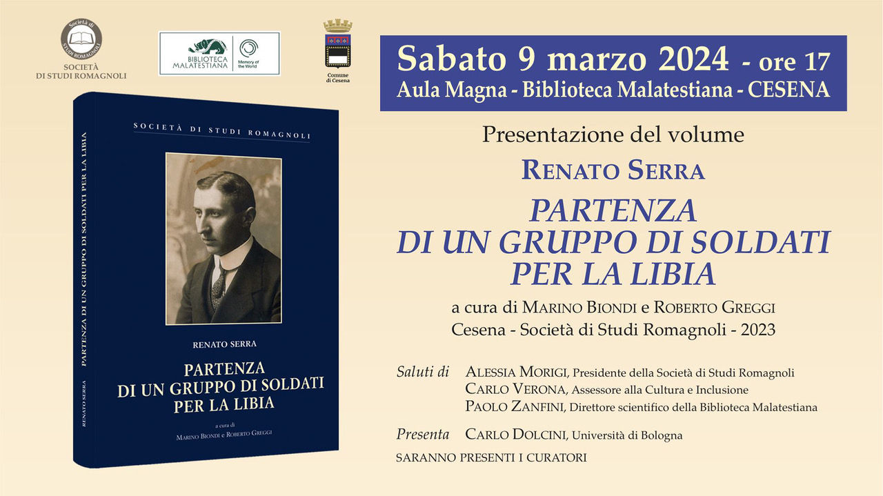 Sarà presentato sabato 9 marzo, alle 17, nell’Aula Magna della Biblioteca Malatestiana, a Cesena, il volume di Renato Serra “Partenza di un gruppo di soldati per la Libia”, a cura di Marino Biondi e Roberto Greggi (Cesena, Società di studi romagnoli, 2023).