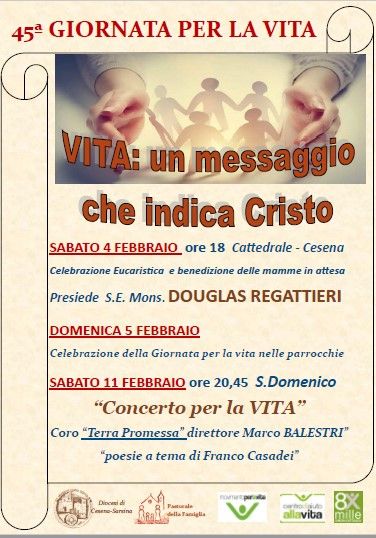 Sabato 11 febbraio alle 20,45, nella chiesa di San Domenico a Cesena, si terrà il “Concerto per la vita” del coro “Terra promessa” di Cesenatico diretto da Marco Balestri. Durante la serata il poeta Franco Casadei leggerà alcune sue poesie a tema.