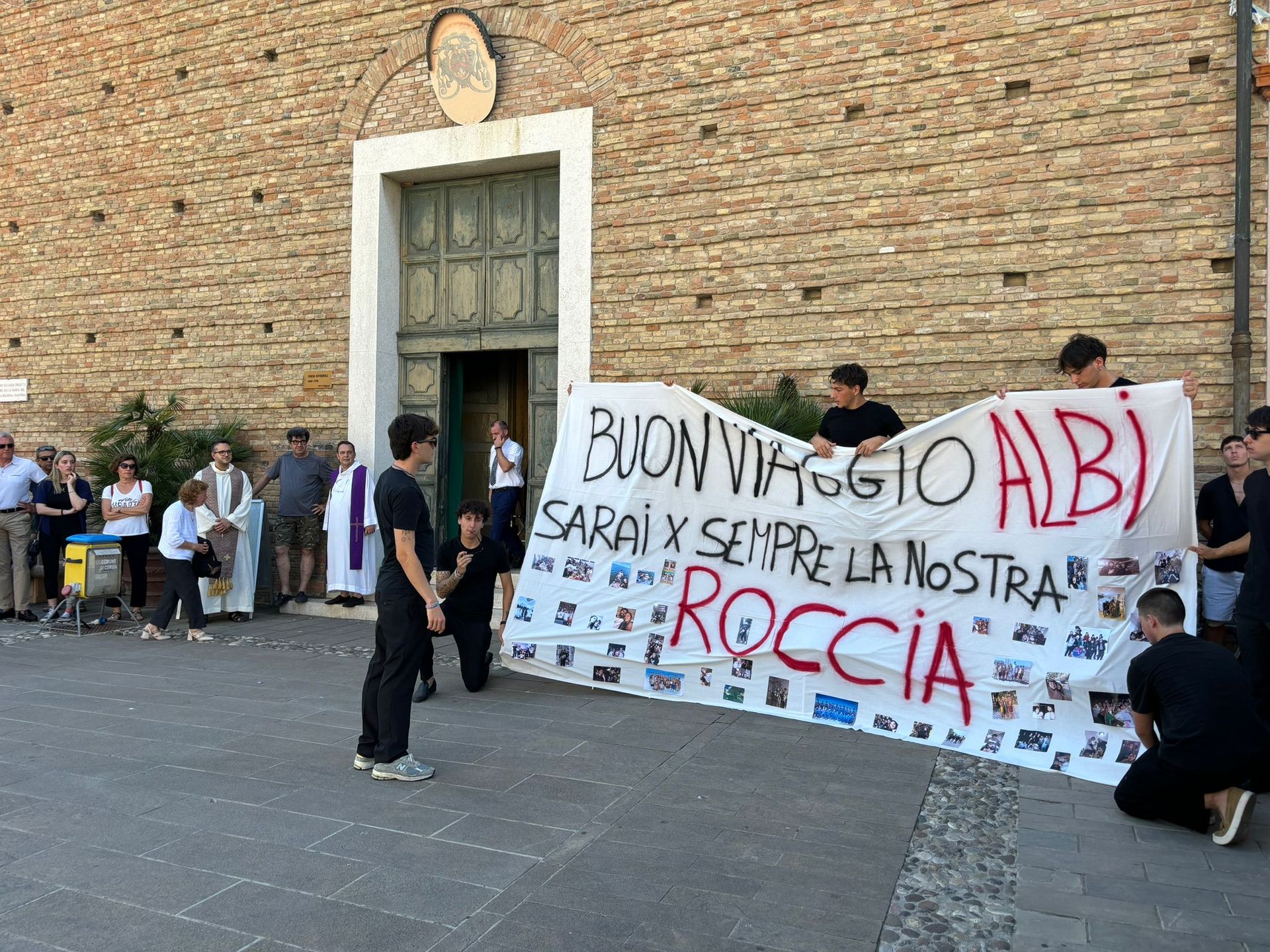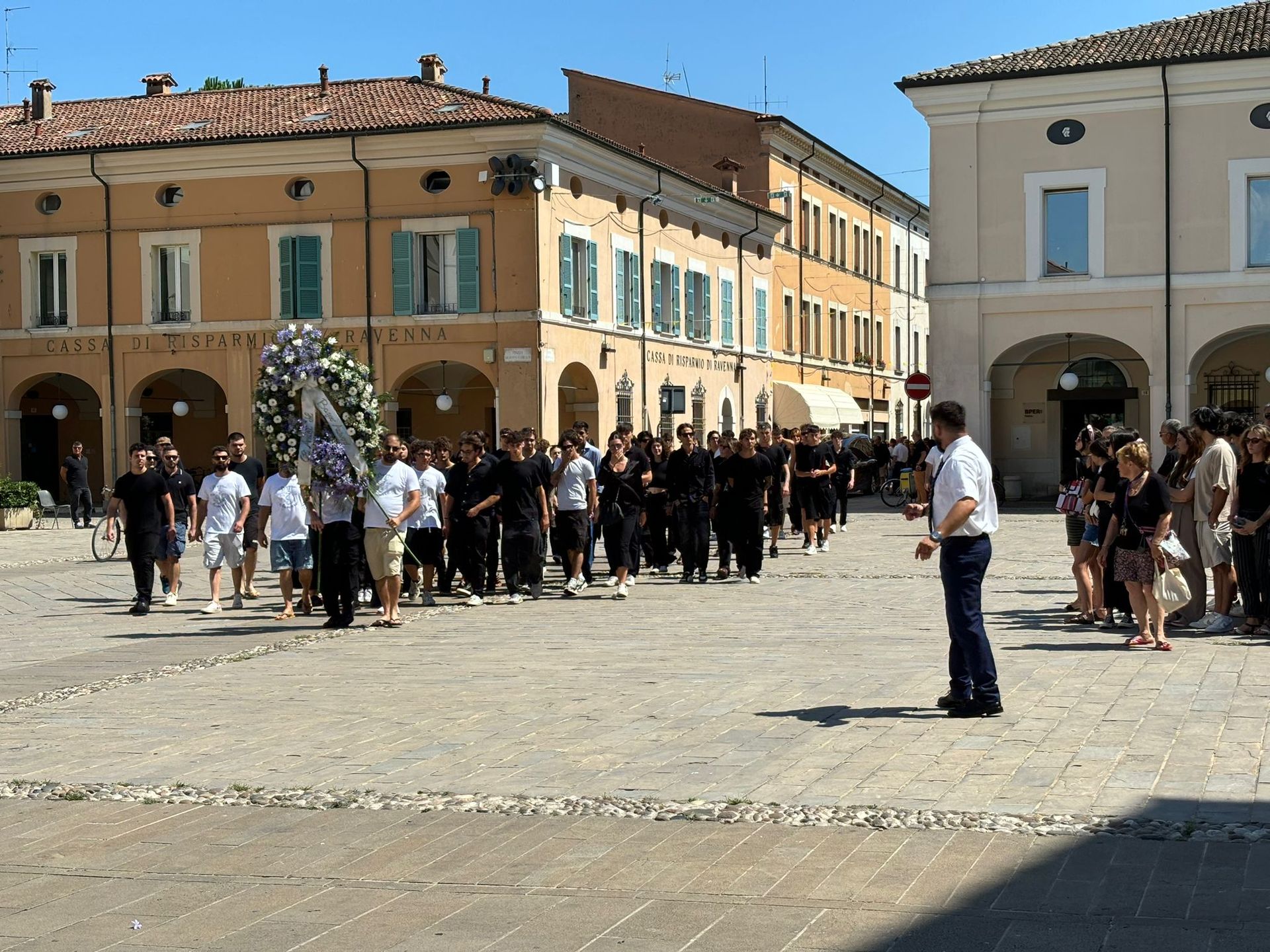 “Buon viaggio, Albi, sarai sempre la nostra roccia”. Con questo striscione i suoi amici, tutti vestiti in nero, hanno accolto, oggi pomeriggio, sulla piazza di Cervia, davanti al Duomo, Alberto Stefano, il giovane giocatore del Cervia United morto lunedì in un incidente in moto sulla via Cervese (vedi “Leggi anche”). Sopra la bara di Alberto, tutte le maglie delle squadre nelle quali ha militato. Dietro, i genitori e la fidanzata Giulia, forti in un dolore, senza fine. Anche i colleghi e gli amici del bagno nel quale ha lavorato hanno voluto esserci, e portare una corona di fiori in processione.