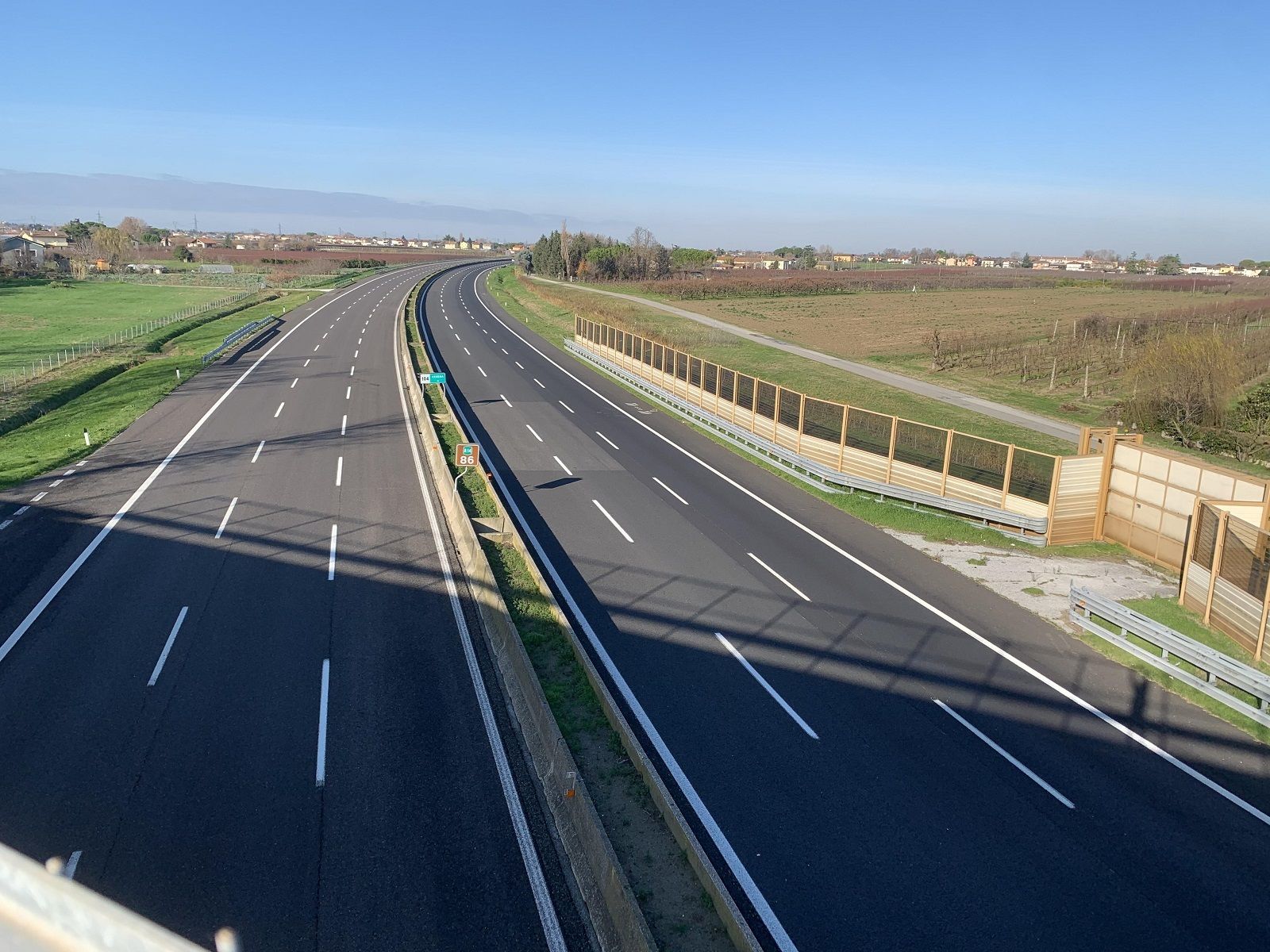 Sopra è ripreso un tratto della A14 tra i caselli di Cesena e Valle del Rubicone: pochissimi i mezzi in circolazione, tanto da poter fotografare l’autostrada deserta.