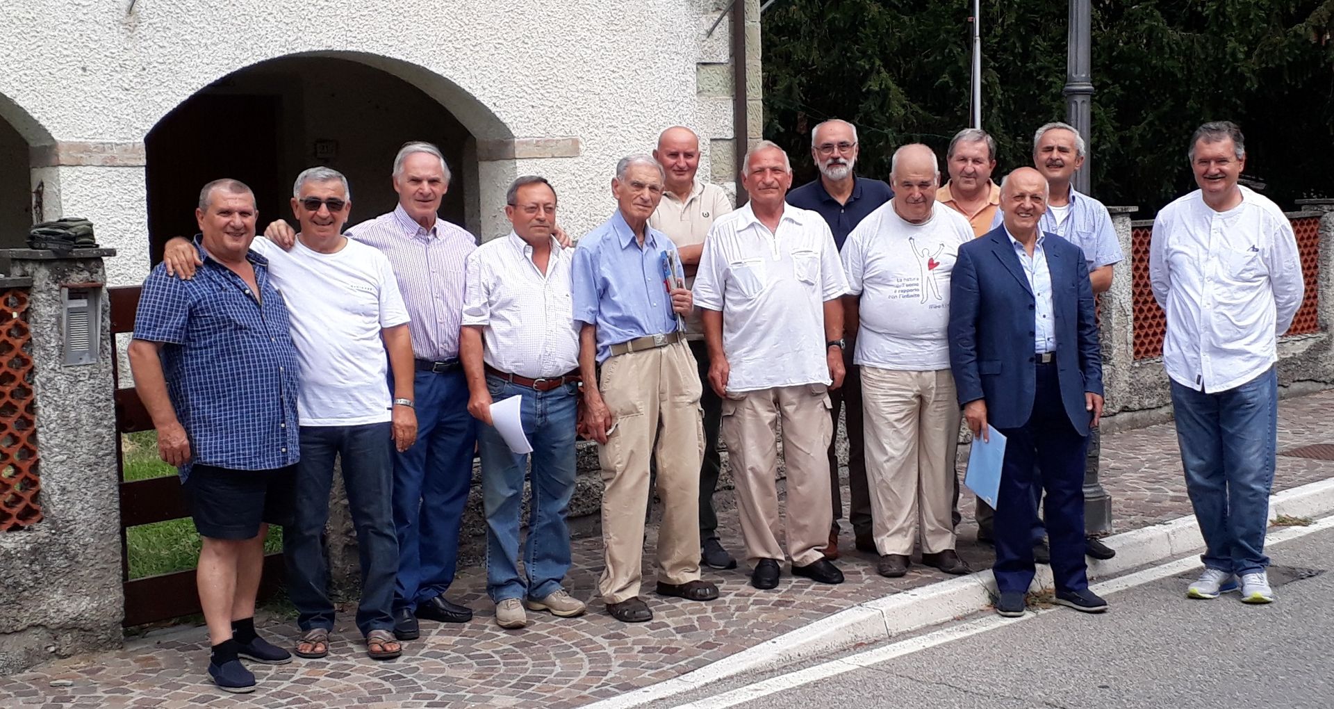 “64 lunghi anni sono passati – scrive uno degli ex alunni in una riflessione – I due pagliai non ci sono più. La vecchia scuola ha lasciato il posto al Museo e la fontanella scorre forse nascosta dietro un muro di cemento. Al posto del Foro Boario c’è un giardino ben curato e la strada della vecchia casa colonica è asfaltata e ben percorsa da tante auto. Sul marciapiede che non c’era 12 uomini e un Maestro rifanno di nuovo la foto, che li ha visti bambini. Nessuno ha il grembiule e nessuno siede a terra – siamo ancora capaci di reggerci in piedi per ora. Quelli che mancano ci sono lo stesso, quelli “partiti” ci guardano dal Cielo. 64 anni e tanto piacere di rivederci.