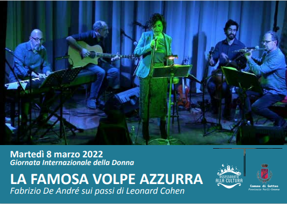 Martedì 8 marzo alle 21 all’Oratorio di San Rocco a Gatteo si svolgerà il concerto letterario La famosa volpe azzurra, viaggio poetico-musicale attraverso i ritratti femminili tratteggiati nei brani di Fabrizio De André sui passi di Leonard Cohen. Il titolo dello spettacolo, ideato e diretto da Liana Mussoni, richiama l’immagine evocata da De André nella traduzione di una celebre canzone del cantautore canadese: Famous blue raincoat.