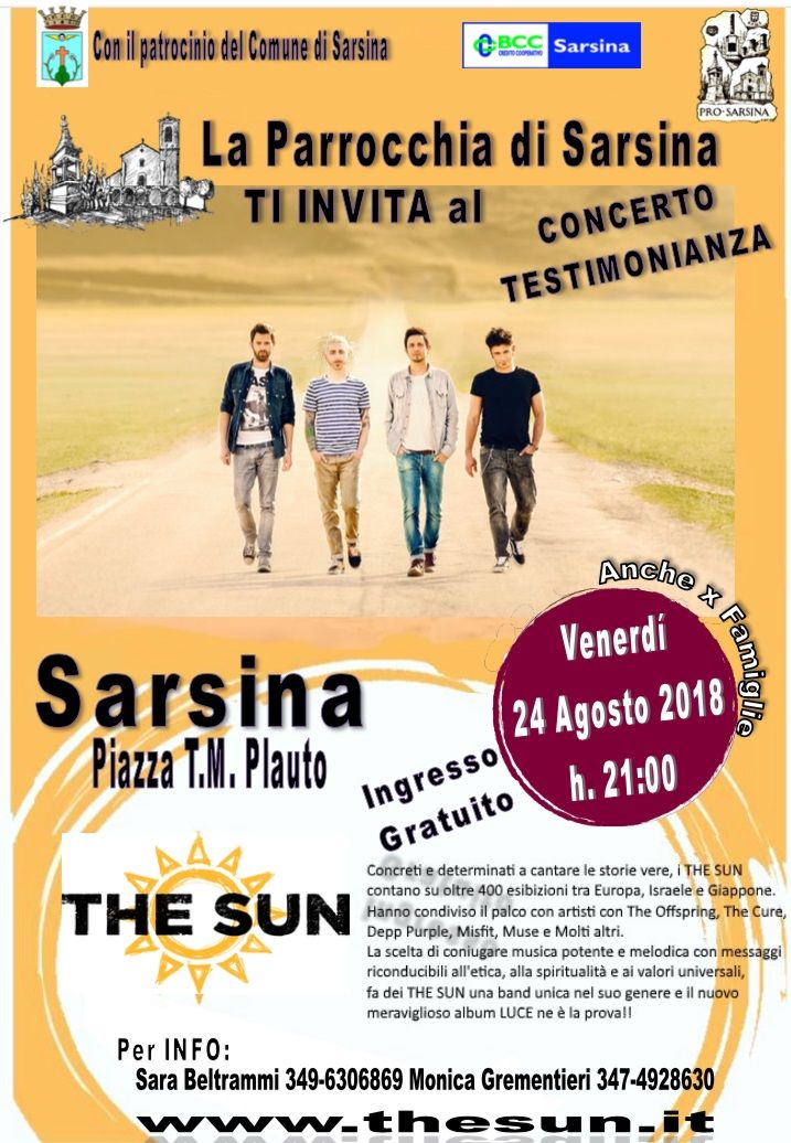 La sera di venerdì 24 agosto, in occasione della festa di San Vicinio, il gruppo rock The Sun presenterà a Sarsina il nuovo spettacolo.E’ un’occasione grande da non perdere. Per tutti i giovani della Diocesi. Per tutti gli appassionati di musica. Di quella che sa esprimere un contenuto