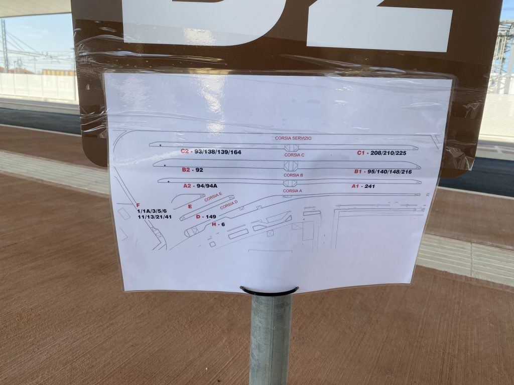 Su ogni cartello che indica una corsia è affisso un foglio con la pianta dell’area, per potersi orientare nella nuova e grande autostazione (foto).