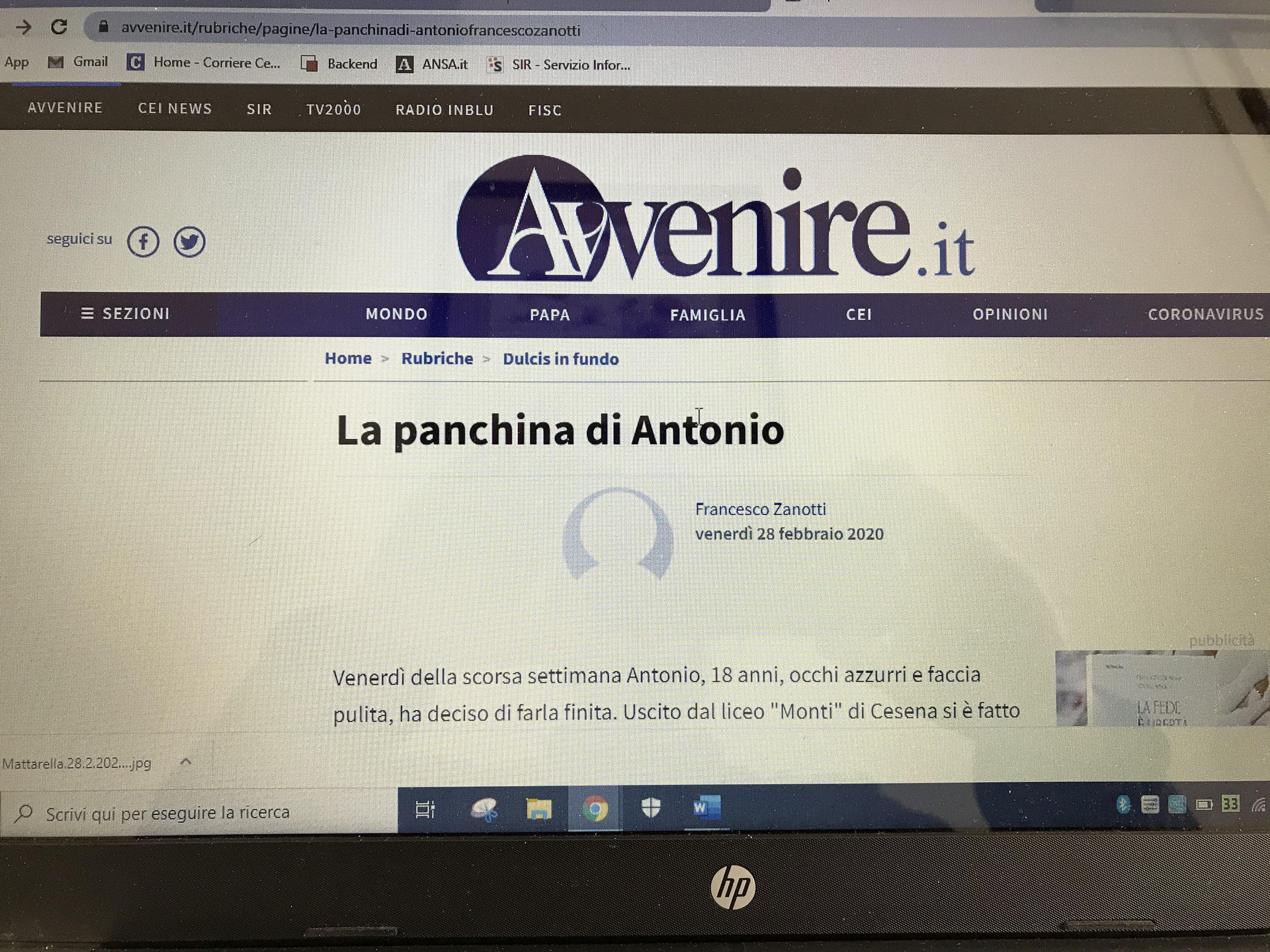 La panchina di Antonio finisce nella rubrica Dulcis in fundo di Avvenire
