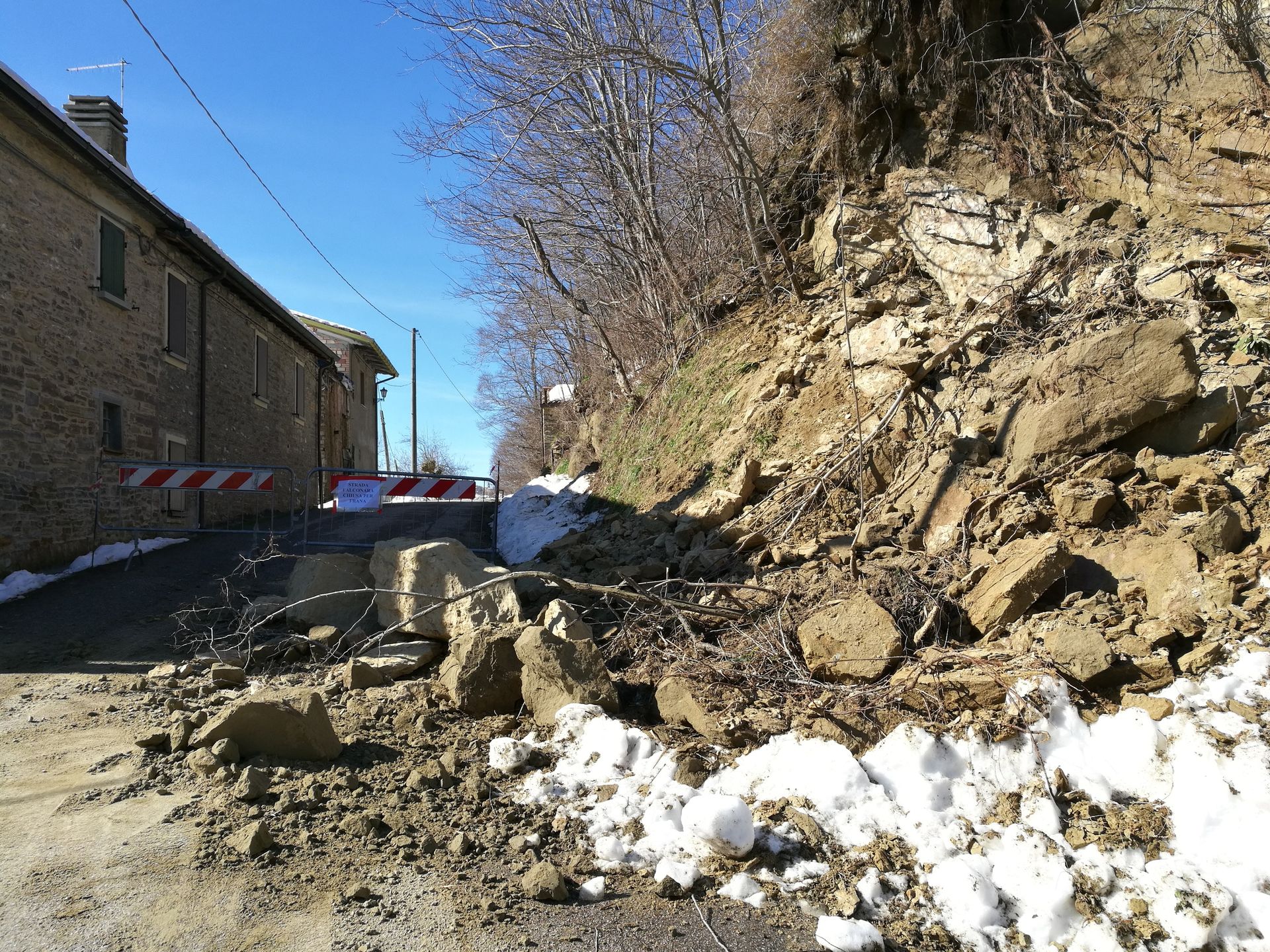 “Le situazioni più importanti di certo sono in via Fiume, in località Bacciolino, e la via Vertaglia, che presenta un fronte ampio e abbastanza profondo (v. foto sotto, ndr.). Non resta altro che monitorare le evoluzioni del movimenti, fronteggiare le situazioni più preoccupanti o disagevoli per i cittadini, e prendersi cura di chi è rimasto isolato con tutti i mezzi necessari. Occorrerà aspettare che il terreno riprenda un minimo di compattezza per effettuare i primi sopralluoghi post emergenza e valutare l’entità dei danni, per poter fare una stima dei lavori da fare. Questi eventi sono molto frequenti su un territorio, come il nostro, caratterizzato geologicamente dai “gessi”. Sono zone che per la loro intrinseca natura, subiscono maggiormente questa tipologia di fenomeni, che si concretizzano infine con dissesti idrogeologici di varia entità”.