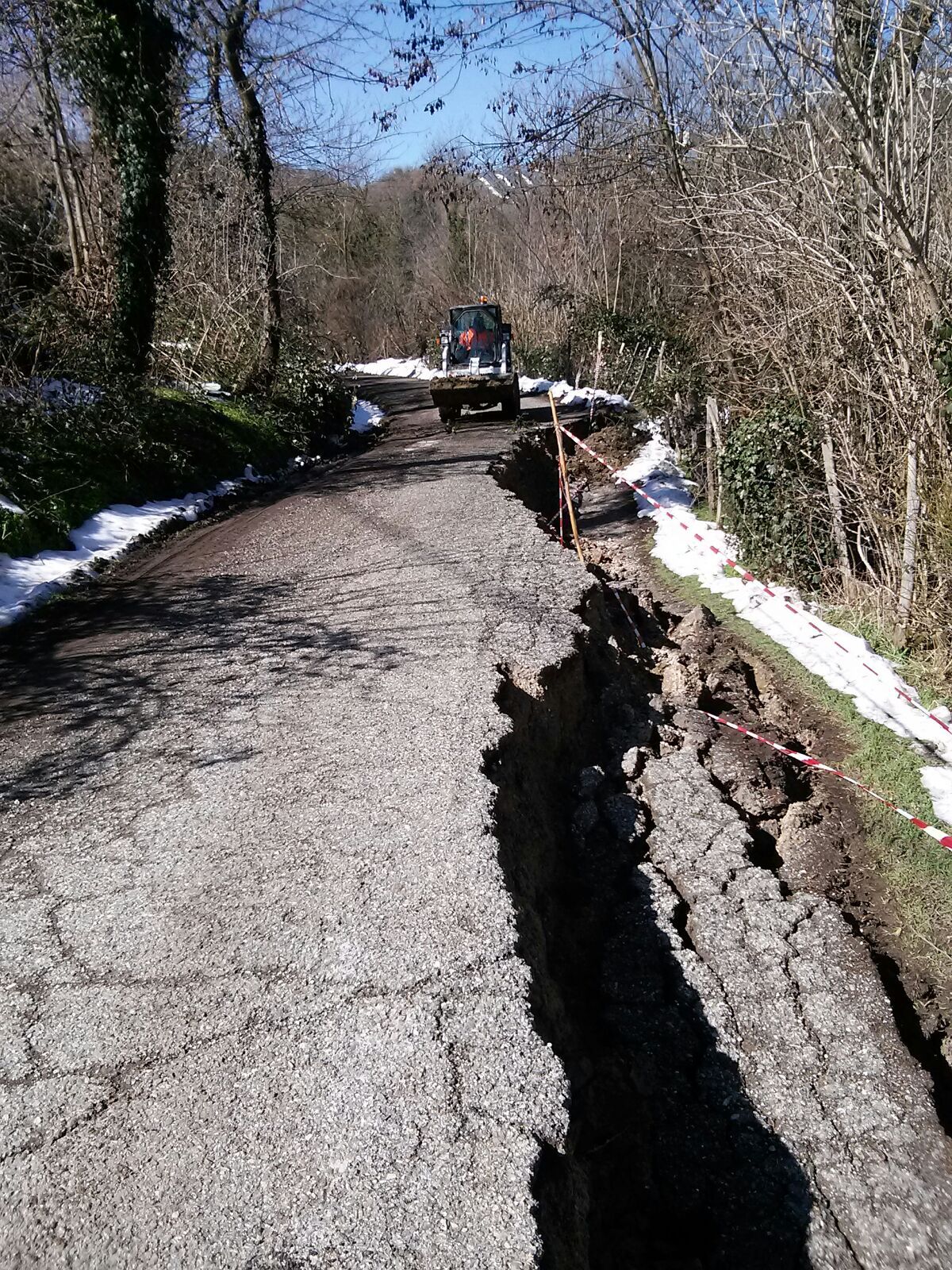 “Le situazioni più importanti di certo sono in via Fiume, in località Bacciolino, e la via Vertaglia, che presenta un fronte ampio e abbastanza profondo (v. foto sotto, ndr.). Non resta altro che monitorare le evoluzioni del movimenti, fronteggiare le situazioni più preoccupanti o disagevoli per i cittadini, e prendersi cura di chi è rimasto isolato con tutti i mezzi necessari. Occorrerà aspettare che il terreno riprenda un minimo di compattezza per effettuare i primi sopralluoghi post emergenza e valutare l’entità dei danni, per poter fare una stima dei lavori da fare. Questi eventi sono molto frequenti su un territorio, come il nostro, caratterizzato geologicamente dai “gessi”. Sono zone che per la loro intrinseca natura, subiscono maggiormente questa tipologia di fenomeni, che si concretizzano infine con dissesti idrogeologici di varia entità”.