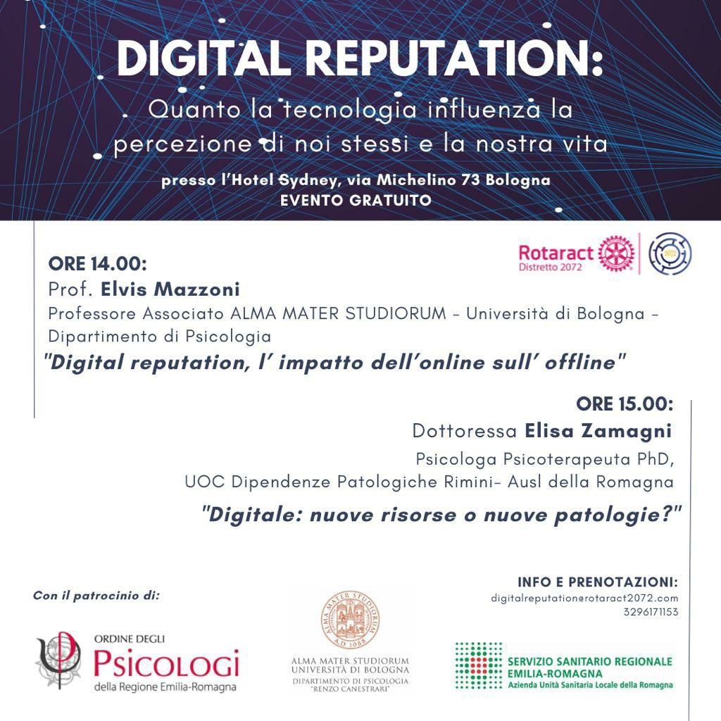 Il Distretto Rotaract 2072 (Emilia Romagna e San Marino) promuove il service di carattere divulgativo “Digital reputation”, una conferenza dedicata al tema di come i social network oggi rischino di intaccare la salute mentale dei giovani e di come la tecnologia influenza la percezione di noi stessi e della nostra vita.