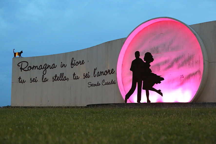 Chi percorrerà la Rigossa avrà quindi l’occasione di vedere la rotonda “Romagna Mia” con una luce diversa. Ideata dai designer Manzi e Zanotti, la rotonda rievoca il celebre verso della canzone più famosa di Casadei ed è concepita come un grande schermo con sagome di orchestrali sul lato mare, mentre a monte altre sagome danzano sulle note di un immaginario walzer.