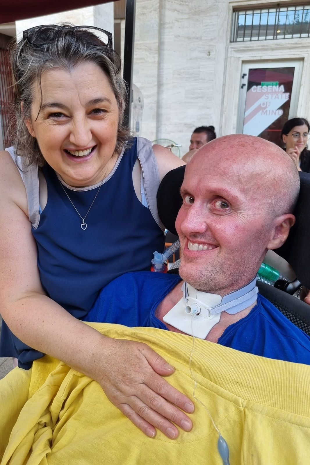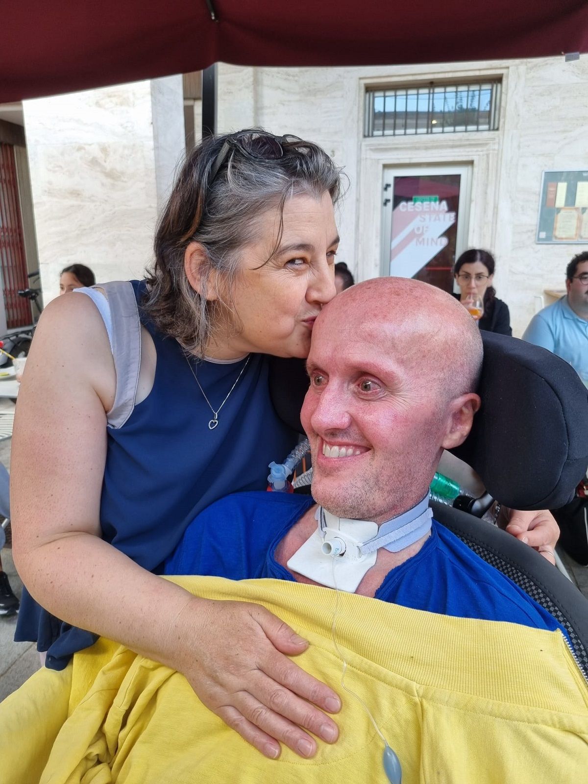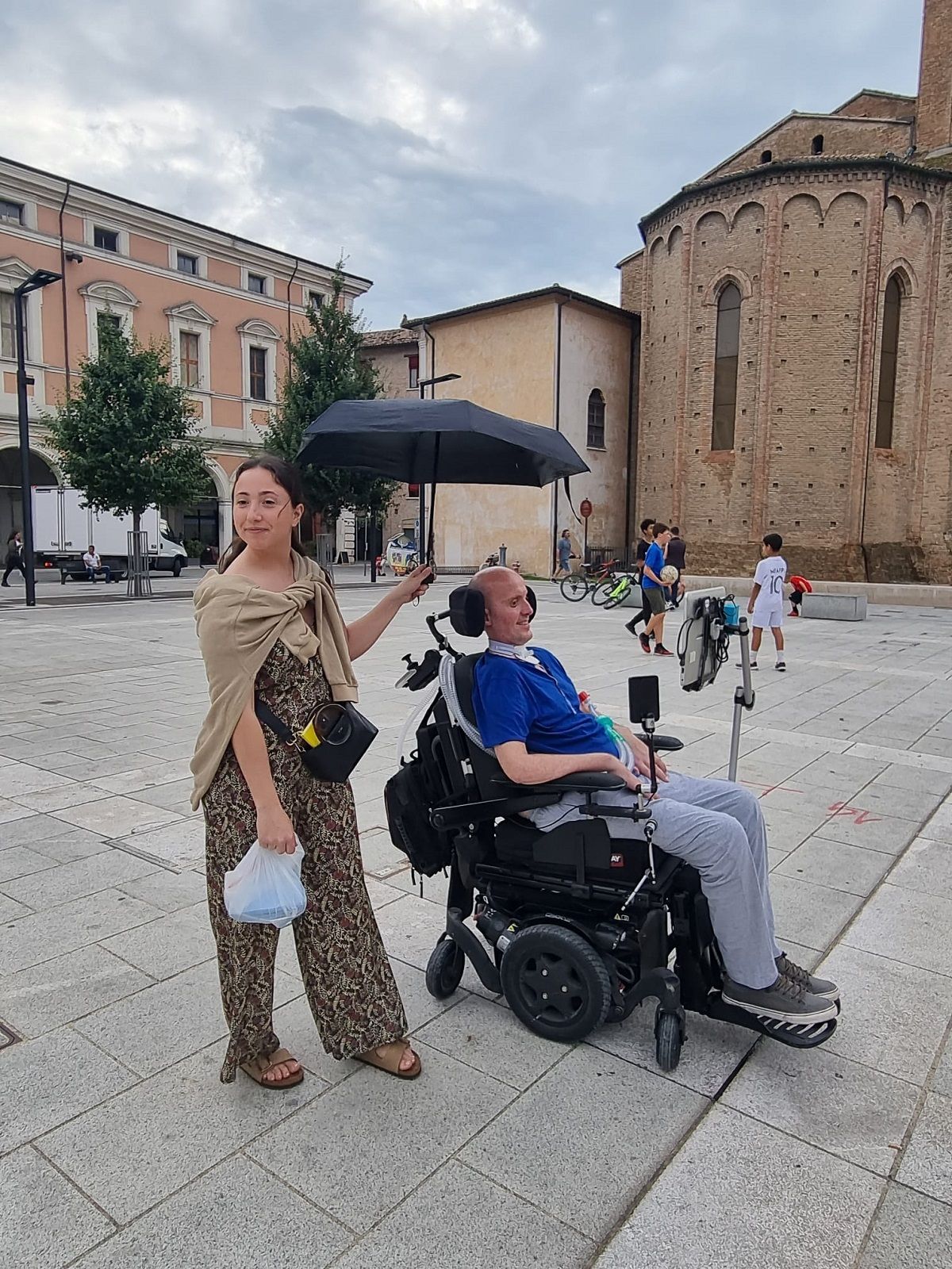Il giro programmato ha come obiettivo finale il centro città, quello che la moglie Cristina non vede più da tanto tempo, da quando piazza della Libertà era ancora formato parcheggio. Il carico e lo scarico della carrozzina non è mai banale e non bisogna avere fretta, come non ne ha un ammalato di Sla, prigioniero nel suo corpo, ma libero di amare di volare, con la mente e il cuore.