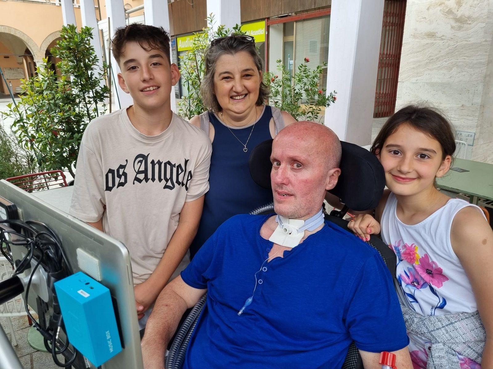 In casa Simone è visibilmente emozionato e grazie al suo puntatore oculare riesce a trasmettere le sue emozioni e a raccontare la sua avventura con la malattia. “All’inizio, era il 2017, ho perso un po’ di forza dalle dita della mano – spiega -. Poi la difficoltà è passata alle braccia. E piano piano è successo tutto il resto. La diagnosi è del marzo 2018”, impietosa. Seguono le difficoltà nella deglutizione e nell’articolazione della parola. “Nel gennaio 2019 gli davo da mangiare io”, precisa la moglie. Con l’arrivo del Covid, nel gennaio dello scorso anno si è reso necessario un ricovero in terapia intensiva cui è seguita la tracheotomia. Insomma, una vita sempre più complicata per Simone e per chi gli vive accanto.