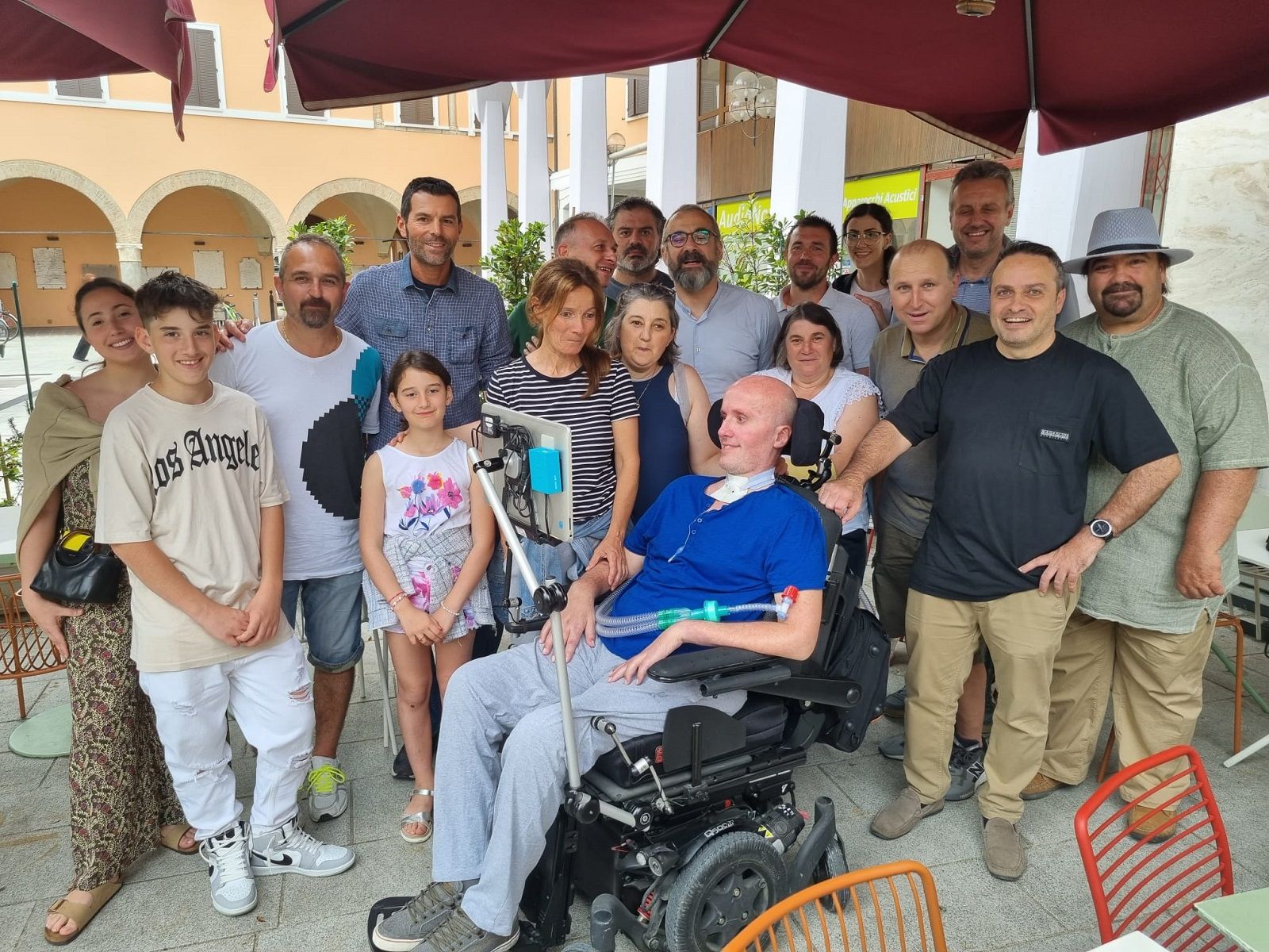 Metti un aperitivo in centro con Simone. E con lui, sua moglie e i suoi due figli. Poi la sorella, i cognati, i nipoti, gli amici più stretti, quelli di sempre di Gattolino, e quelli più lontani. Alla fine ne viene fuori una bella compagnia allegra e variegata che si ritrova in posa per la foto ricordo (foto in alto). Lì, attorno alla carrozzina su cui Simone è costretto dalla Sla c’è tanta voglia di vivere e di fare festa. Di stare insieme per un’ora o due come si faceva ai vecchi tempi, quando quella terribile malattia non c’era e la realtà appariva in tutta la sua bellezza.