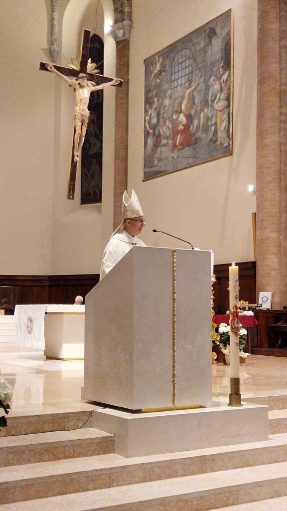 Pubblichiamo di seguito l’omelia che il vescovo di Cesena-Sarsina, l’arcivescovo Antonio Giuseppe Caiazzo, sta pronunciando ora in Cattedrale a Cesena, durante la Messa nella notte di Pasqua. Nella stessa celebrazione verranno impartiti i sacramenti dell’iniziazione cristiana a dieci catecumeni (cfr pezzo al link qui sotto). Con l’arcivescovo hanno concelebrato il parroco della Cattedrale, don Giordano Amati, e i canonici don Tonino Domeniconi e don Derno Giorgetti. Sull’altare anche alcuni diaconi, tra cui Emanuele Testi, responsabile diocesano del Catecumenato.