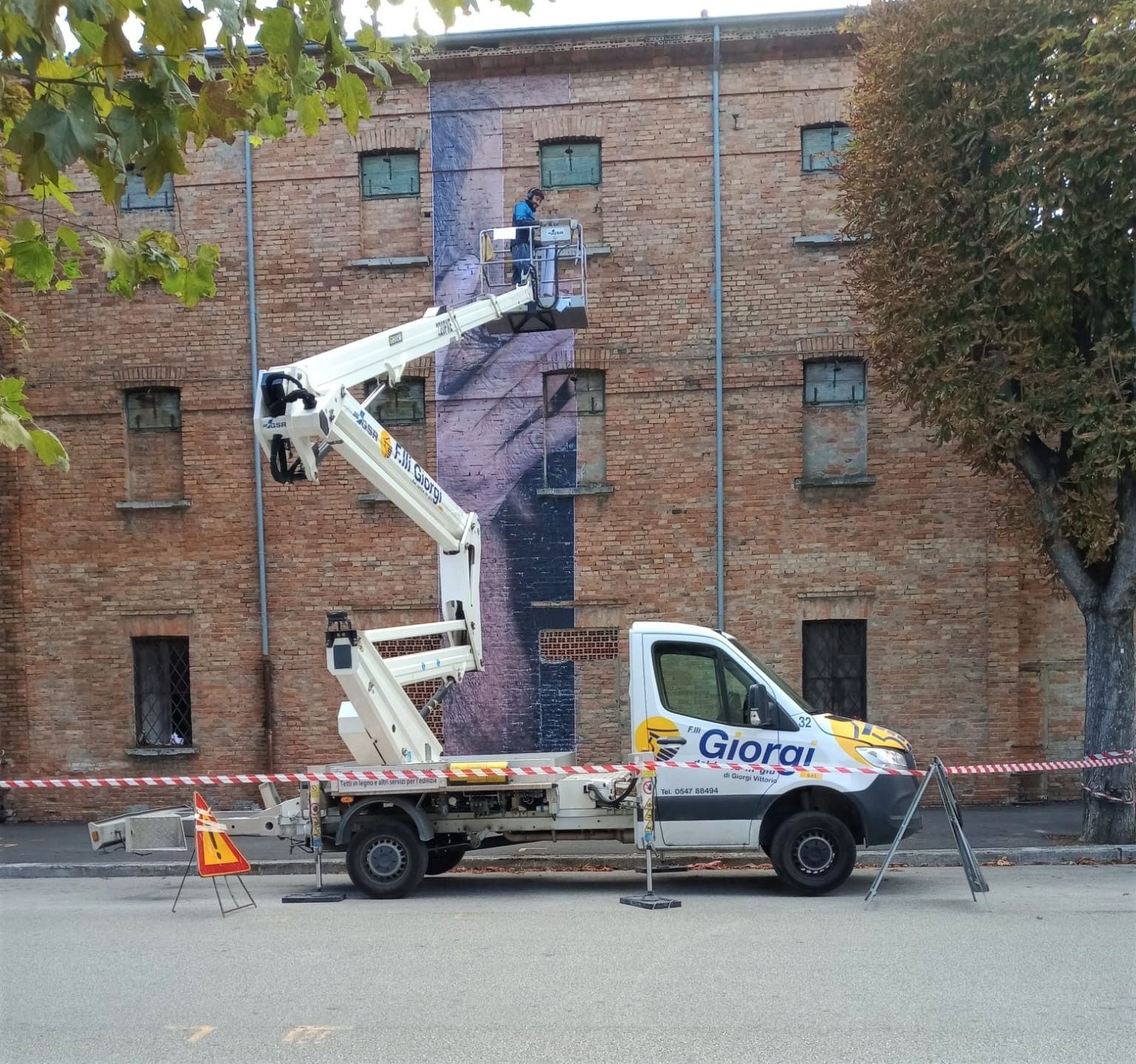 Fino al 17 ottobre, a Gambettola, vari spazi e vie della città ospitano manifesti artistici come una galleria d’arte a cielo aperto. In viale Carducci, l’artista Bifido è al lavoro per realizzare un’opera di street poster art sulla facciata dell’ex tabacchificio Sacta (foto sotto).