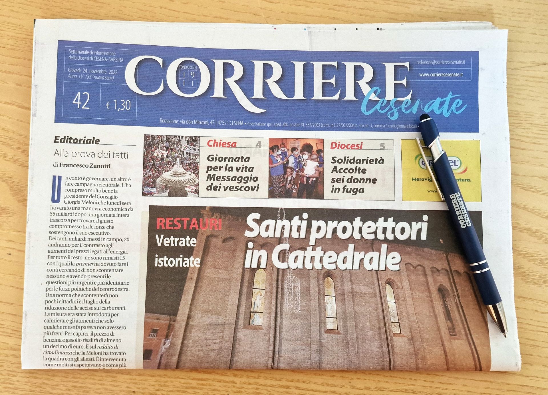 È in edicola e nelle case degli abbonati da oggi, giovedì 24 novembre, il numero 42 dell’edizione cartacea del Corriere Cesenate. In prima pagina le nuove vetrate della cattedrale, che ora narrano store di santi. L’inaugurazione è in programma domenica 27 novembre, alle 18, con la Messa nell’anniversario di ordinazione episcopale del vescovo Douglas Regattieri. Sul settimanale, l’approfondimento a firma di Marino Mengozzi.
