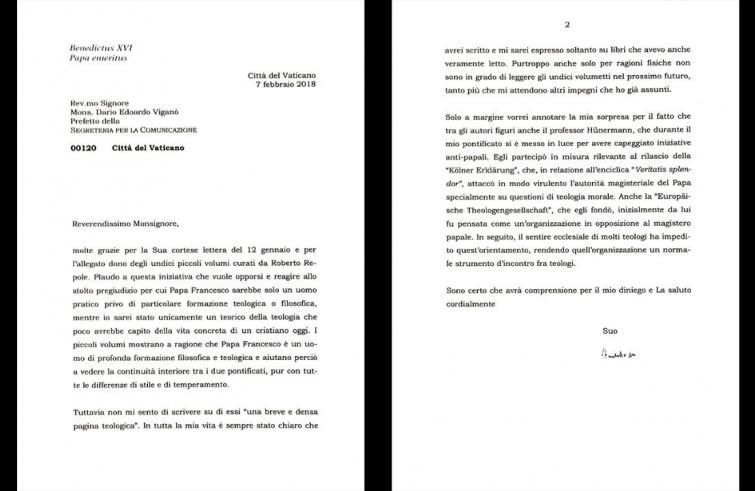 “Reverendissimo Monsignore, molte grazie per la sua cortese lettera del 12 gennaio e per l’allegato dono degli 11 piccoli volumi curati da Roberto Repole. Plaudo a questa iniziativa che vuole opporsi e reagire allo stolto pregiudizio per cui Papa Francesco sarebbe solo un uomo pratico privo di particolare formazione teologica o filosofica, mentre io sarei stato unicamente un teorico della teologia che poco avrebbe capito della vita concreta di un cristiano oggi. I piccoli volumi mostrano a ragione che Papa Francesco è un uomo di profonda formazione filosofica e teologica e aiutano perciò a vedere la continuità interiore tra i due pontificati, pur con tutte le differenze di stile e di temperamento.Tuttavia non mi sento di scrivere su di essi ‘una breve e densa pagina teologica’. In tutta la mia vita è sempre stato chiaro che avrei scritto e mi sarei espresso soltanto su libri che avevo anche veramente letto. Purtroppo anche solo per ragioni fisiche non sono in grado di leggere gli undici volumetti nel prossimo futuro, tanto più che mi attendono altri impegni che ho già assunti.Solo a margine vorrei annotare la mia sorpresa per il fatto che tra gli autori figuri anche il professore Hünermann, che durante il mio pontificato si è messo in luce per aver capeggiato iniziative anti-papali. Egli partecipò in misura rilevante al rilascio della ‘Kölner Erklärung’, che, in relazione all’enciclica ‘Veritatis splendor’, attaccò in modo virulento l’autorità magisteriale del Papa specialmente su questioni di teologia morale. Anche la ‘Europäische Theolongesellschaft’, che egli fondò, inizialmente da lui fu pensata come un’organizzazione in opposizione al magistero papale. In seguito, il sentire ecclesiale di molti teologi ha impedito questo orientamento, rendendo quell’organizzazione un normale strumento di incontro fra teologi. Sono certo che avrà comprensione per il mio diniego e La saluto cordialmente”.