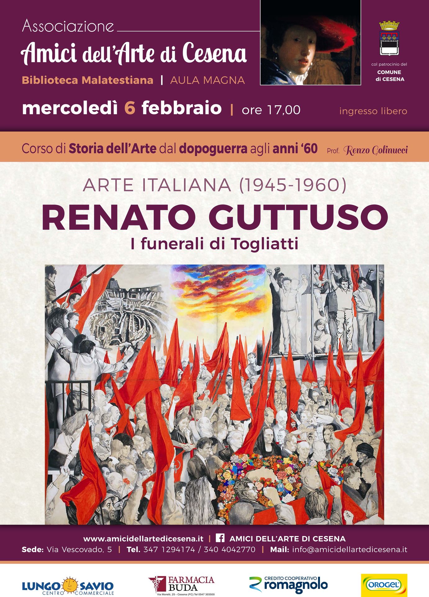 Mercoledì 6 febbraio alle 17 nell’Aula Magna della biblioteca Malatestiana si terrà la lezione su Renato Guttuso “I funerali di Togliatti”.L’appuntamento fa parte del Corso di storia dell’arte dal dopoguerra agli anni 60. Si tratta del secondo ciclo di incontri, promossi dagli Amici dell’arte di Cesena, dedicato all’arte italiana: un periodo non molto ampio e tuttavia complesso, anche per le caratteristiche di apertura e di rapida evoluzione del contesto storico, dopo il conflitto mondiale e negli anni della ricostruzione e della ripresa civile ed economica.Si esamineranno gli artisti rappresentativi nei differenti ambiti di area astratto-geometrica, informale, figurativa, sino alla congiuntura degli anni finali del decennio, quando andarono definendosi nuovi indirizzi.Ingresso libero