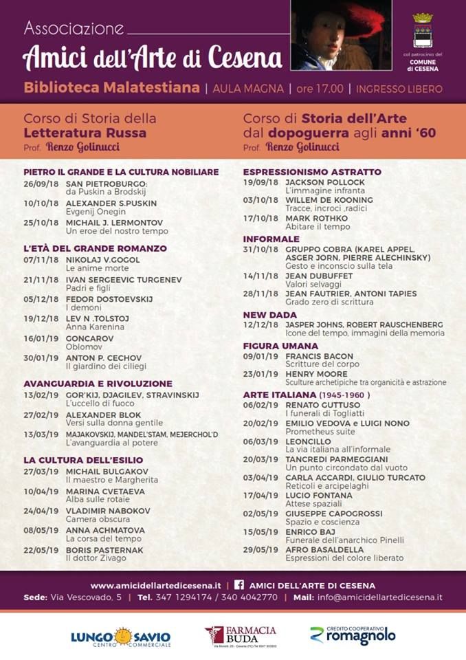 L’associazione cesenate “Amici dell’arte” ha pubblicato i programmi delle lezioni di arte e letteratura che avranno luogo nell’aula magna della Malatestiana alle 17.
