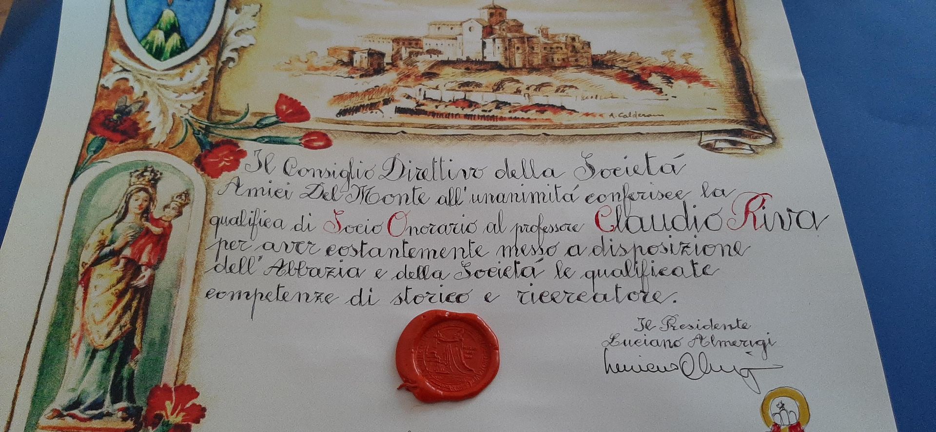 A conclusione dell’assemblea il presidente Almerigi, a nome del Consiglio della Società Amici del Monte, ha nominato Claudio Riva socio onorario. Come si legge nella pergamena – vergata dall’artista cesenate Adelmo Calderoni e scritta in bella calligrafia dal socio Loris Pasini – “per aver costantemente messo a disposizione dell’Abbazia e della Società le qualificate competenze di storico e ricercatore”. Da sempre vicino alla vita spirituale e culturale dell’abbazia benedettina di Cesena, il professo Riva è direttore dell’archivio storico della Diocesi. Per la SaM ha curato, in particolare, il libro che ha raccontato i primi cinquant’anni del sodalizio, e il volume “Bonifiche Benedettine alla Bagnarola”.
