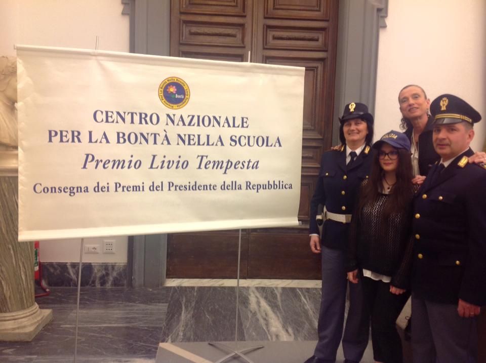 A ritirare il premio erano presenti Giulia e i suoi familiari, i docenti che hanno seguito il progetto, il Sovrintendente Capo della Polizia di Stato Roberto Mascioli, l’Assistente Capo Coordinatore della Polizia di Stato e il dirigente scolastico Sabrina Rossi. “La Bontà non la si può insegnare a Scuola, la Bontà si trasmette per contagio e per la Bontà, per fortuna, non esiste un vaccino. Siamo lieti di poter contagiare ogni anno, con le nostre azioni, tanti nostri alunni!”, ha commentato il dirigente.