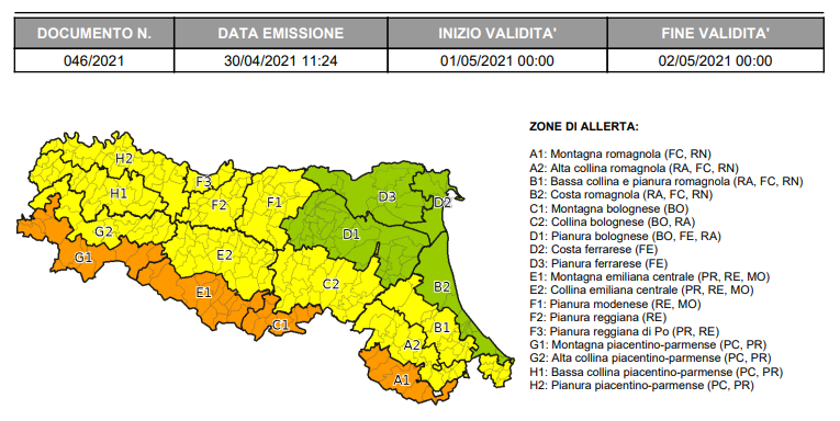 Nella giornata di sabato 1° maggio intense correnti instabili sud-occidentali, associate all’ingresso di una perturbazione dal settore tirrenico, determineranno un significativo peggioramento del meteo. Lo prevede il servizio di Protezione civile regionale, che ha appena emesso un’allerta gialla per temporali e arancione per vento su buona parte del territorio emiliano-romagnolo.