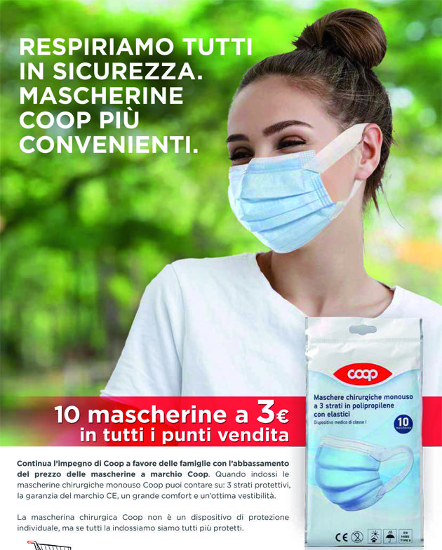 Continua così l’impegno di Coop a favore delle famiglie con l’abbassamento del prezzo delle mascherine a marchio Coop. “Abbiamo ritenuto di dover intervenire sul prezzo finale portandolo dai 5 euro iniziali ai 3 attuali, rendendo quindi l’acquisto ancora più conveniente – spiega nella nota stampa Maura Latini, amministratore delegato Coop Italia –. È sempre più determinante ricorrere all’uso continuo delle mascherine che sono una delle poche misure efficaci per combattere il virus e riteniamo così facendo di metterci a servizio della collettività”.