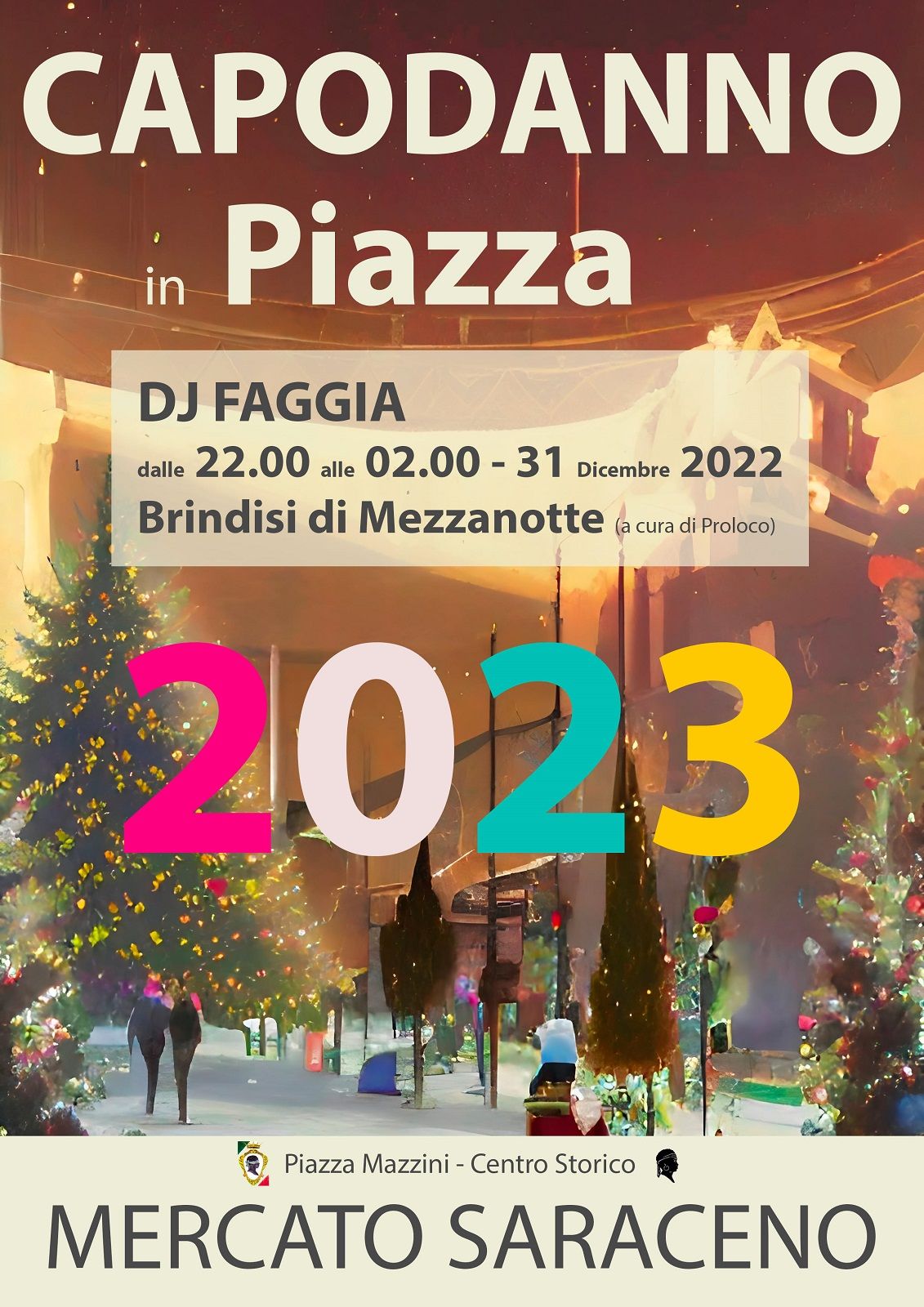Dalle 22 del 31 dicembre fino all’una (e anche più) del primo gennaio 2023, in piazza Mazzini tanta musica, canti e balli per dare la possibilità a chi vuol stare in compagnia di uscire di casa e trovarsi insieme a condividere le ore che traghettano l’anno vecchio a quello nuovo. Il Dj set è affidato al dj Faggia che con la sua musica selezionata saprà riscaldare gli animi e portare la giusta allegria della festa.