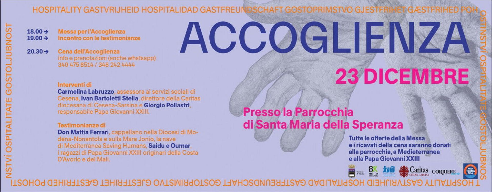 Domani, venerdì 23 dicembre, la parrocchia di Santa Maria della Speranza, in via Tripoli 185 a Cesena (zona Ippodromo) ospiterà l’evento benefico “Accoglienza”.