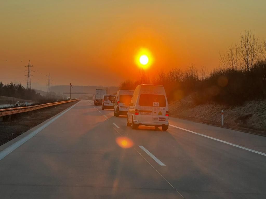 Nella notte appena trascorsa ci siamo fermati, attorno alle 2,50, a dormire in auto nel parcheggio di un autogrill a 120 chilometri dal confine polacco. La temperatura è scesa fino a -4. Siamo stati costretti a tenere le auto in moto per azionare il riscaldamento. Anche questa mattina il freddo è pungente, attorno allo zero. Alle 5,30 ci siamo svegliati e verso le 6 siamo ripartiti.