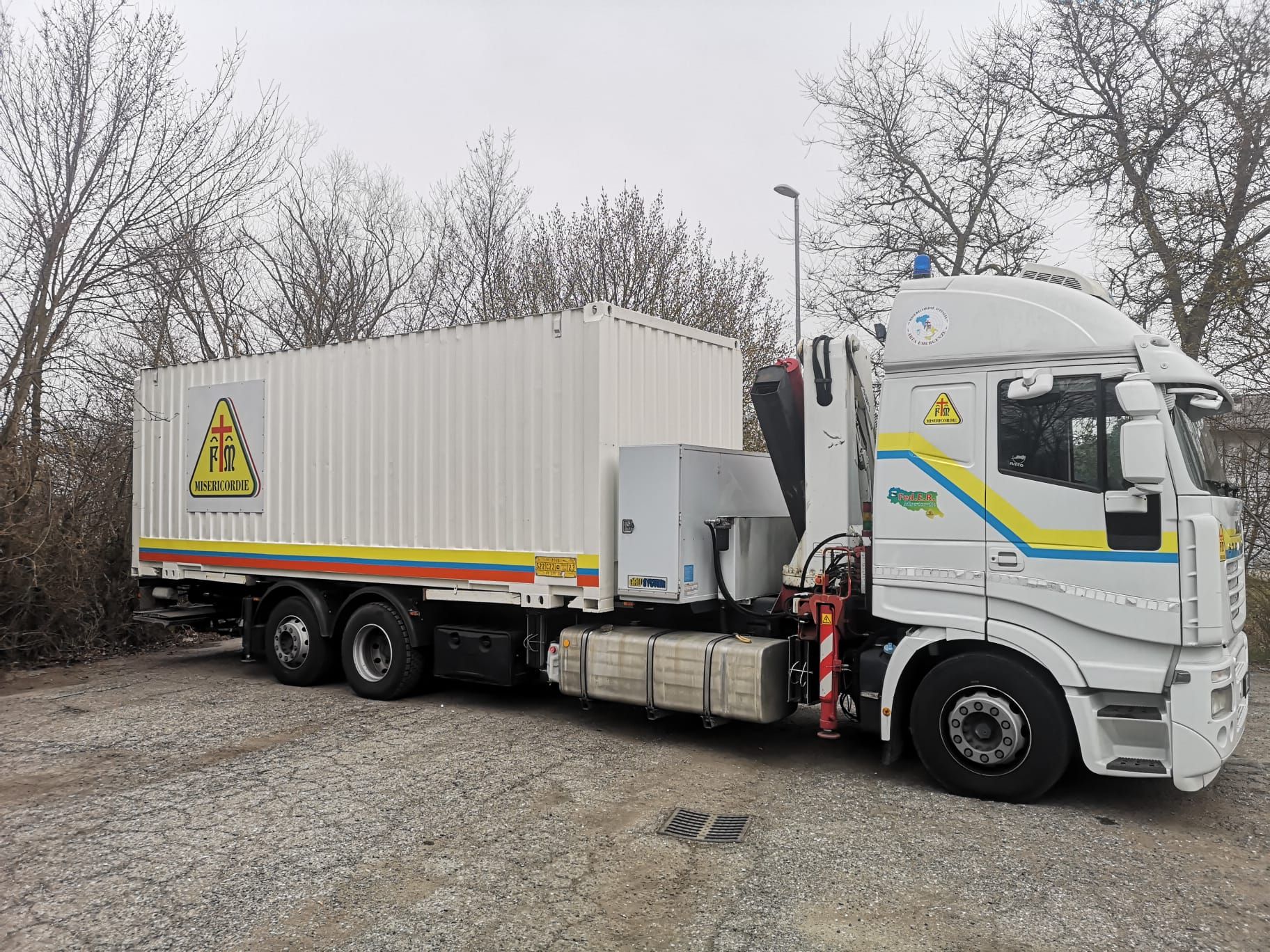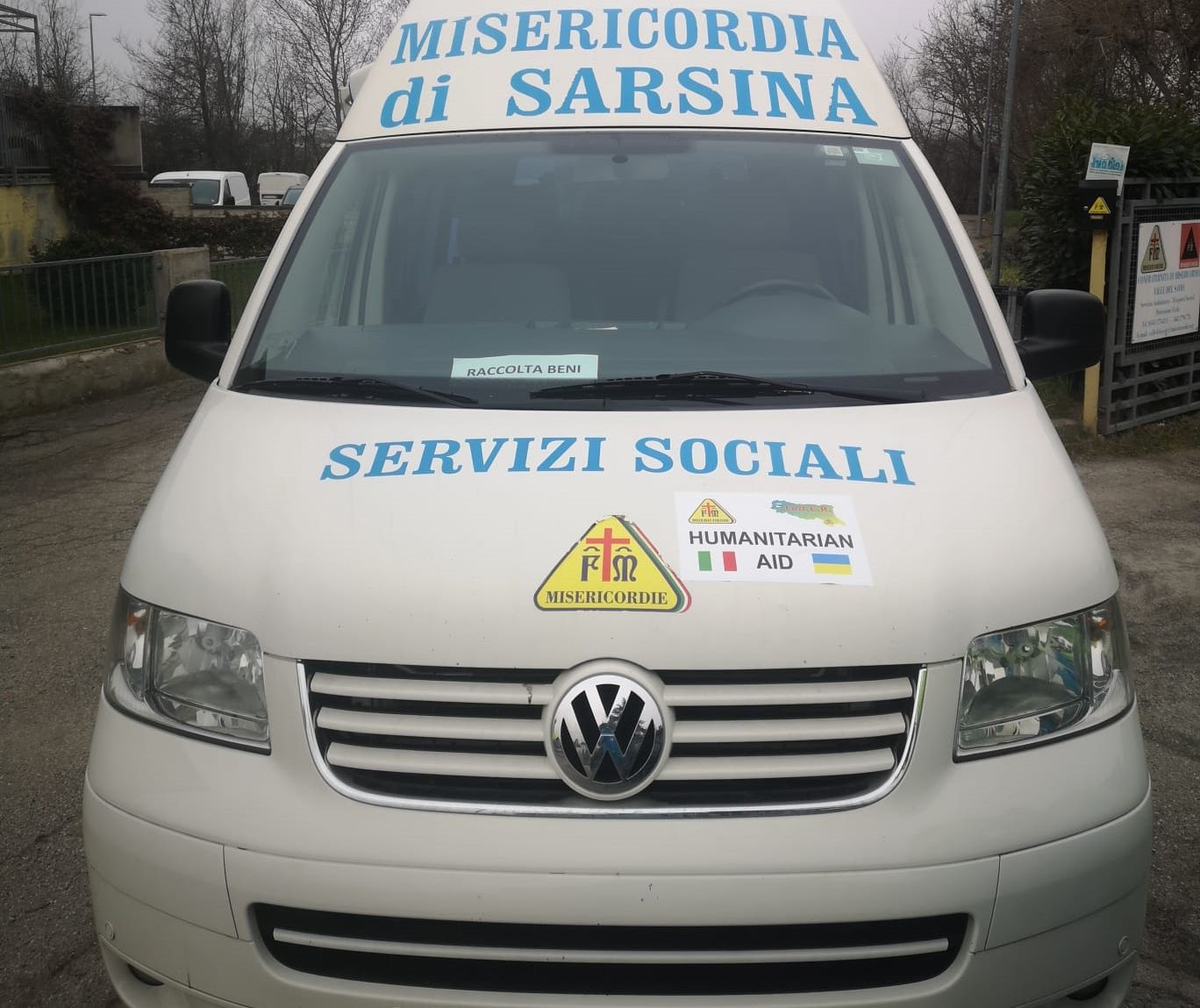 La colonna è formata da quattro mezzi: un tir con un container su cui sono stati caricati 25 bancali di merce; due pulmini e un pick up. Un quinto mezzo si è unito a noi a Castelbolognese. Qui siamo in dieci, tra volontari della Misericordia Valle del Savio e quella di Sarsina. Tra i volontari c’è Giulia Paci, assessore alle politiche sociali a Mercato Saraceno.