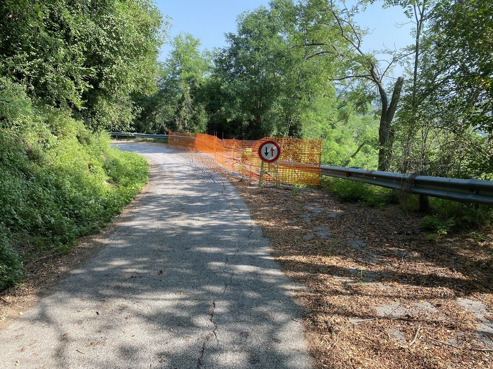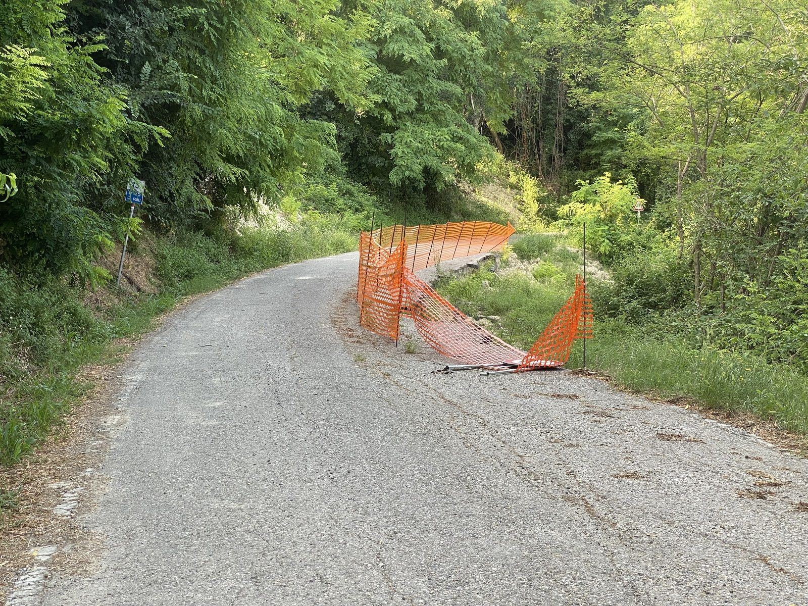 Dal borgo di Monteleone, un luogo dell’entroterra cesenate tutto da scoprire per i turisti che vengono in Romagna per il mare, molti ciclisti salgono e scendono lungo la strada provinciale interdetta al traffico (vedi foto in alto) che è stata colpita da 17 frane ancora tutte aperte. Alcune sono molto pericolose, senza contare gli smottamenti che lungo i costoni in parte invadono la sede stradale.