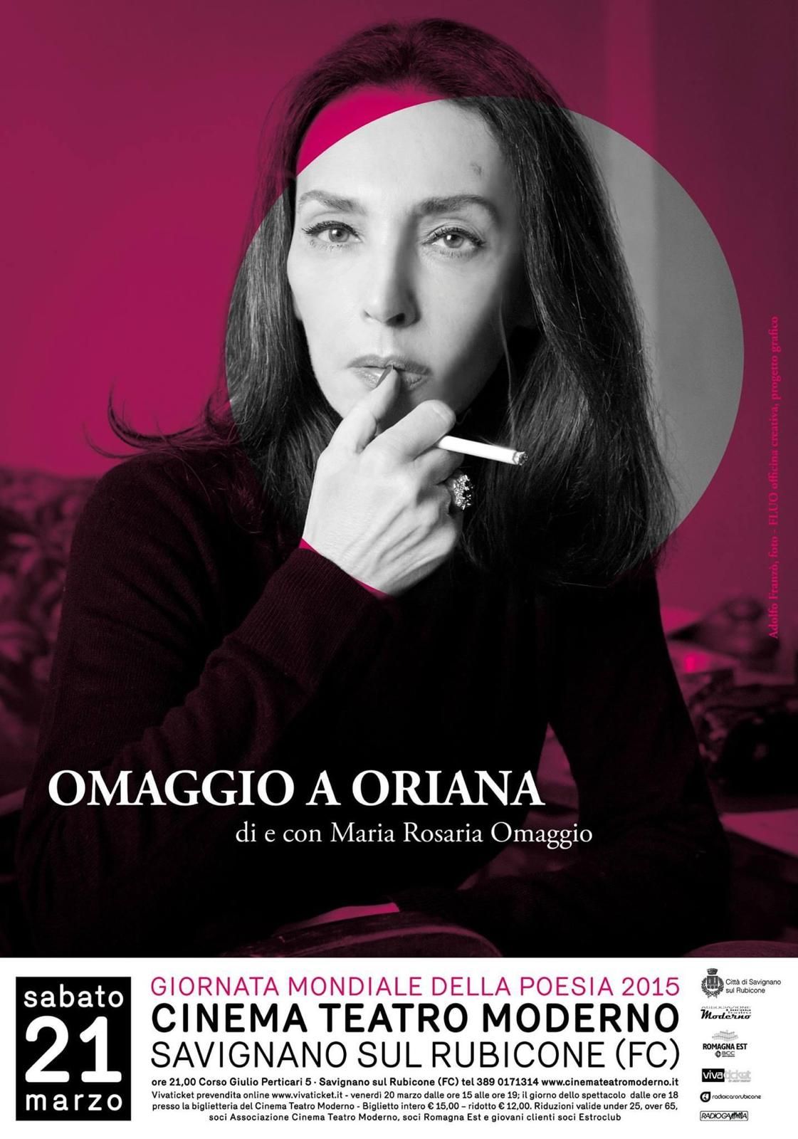Proprio dando voce e volto all’indimenticata autrice fiorentina, Omaggio ha portato a teatro il suo “omaggio” alla Fallaci approdando anche nel Rubicone dove, il 21 marzo 2015 il Cinema Teatro Moderno di Savignano sul Rubicone (foto) ospitò “Omaggio a Oriana”, lo spettacolo tratto dai suoi tanti scritti della Fallaci cui seguì poi anche la proiezione del film di Wajda, “Walesa. L’uomo della speranza (2013, 127’)” biografia d’autore dedicata all’operaio polacco premiato con il Nobel per la pace nel 1983. Qui Maria Rosaria Omaggio interpreta Oriana Fallaci che intervista Lech Walesa (Robert Więckiewicz).