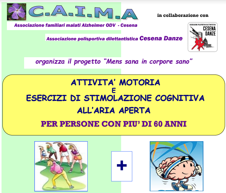 L’associazione Caima, a sostegno dei malati di Alzheimer e loro familiari, organizza il progetto “Mens sana in corpore sano”: un corso di aiuto alla prevenzione della malattia rivolto a persone con più di 60 anni, per svolgere ginnastica ed esercizi cognitivi per la memoria.