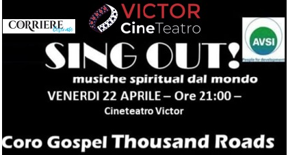 Venerdì 22 aprile alle 21 al Cineteatro Victor appuntamento con Sing Out!, concerto di musiche spiritual dal mondo a cura del coro gospel Thousand Roads.