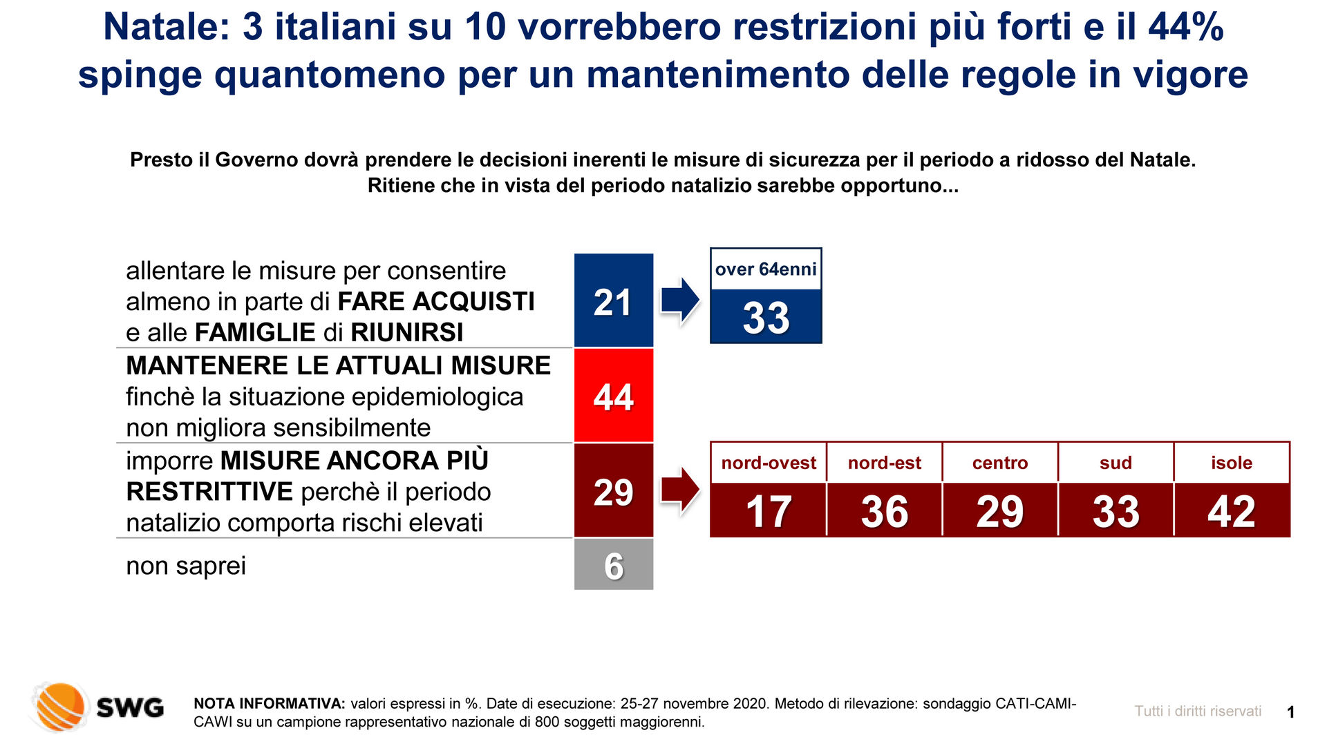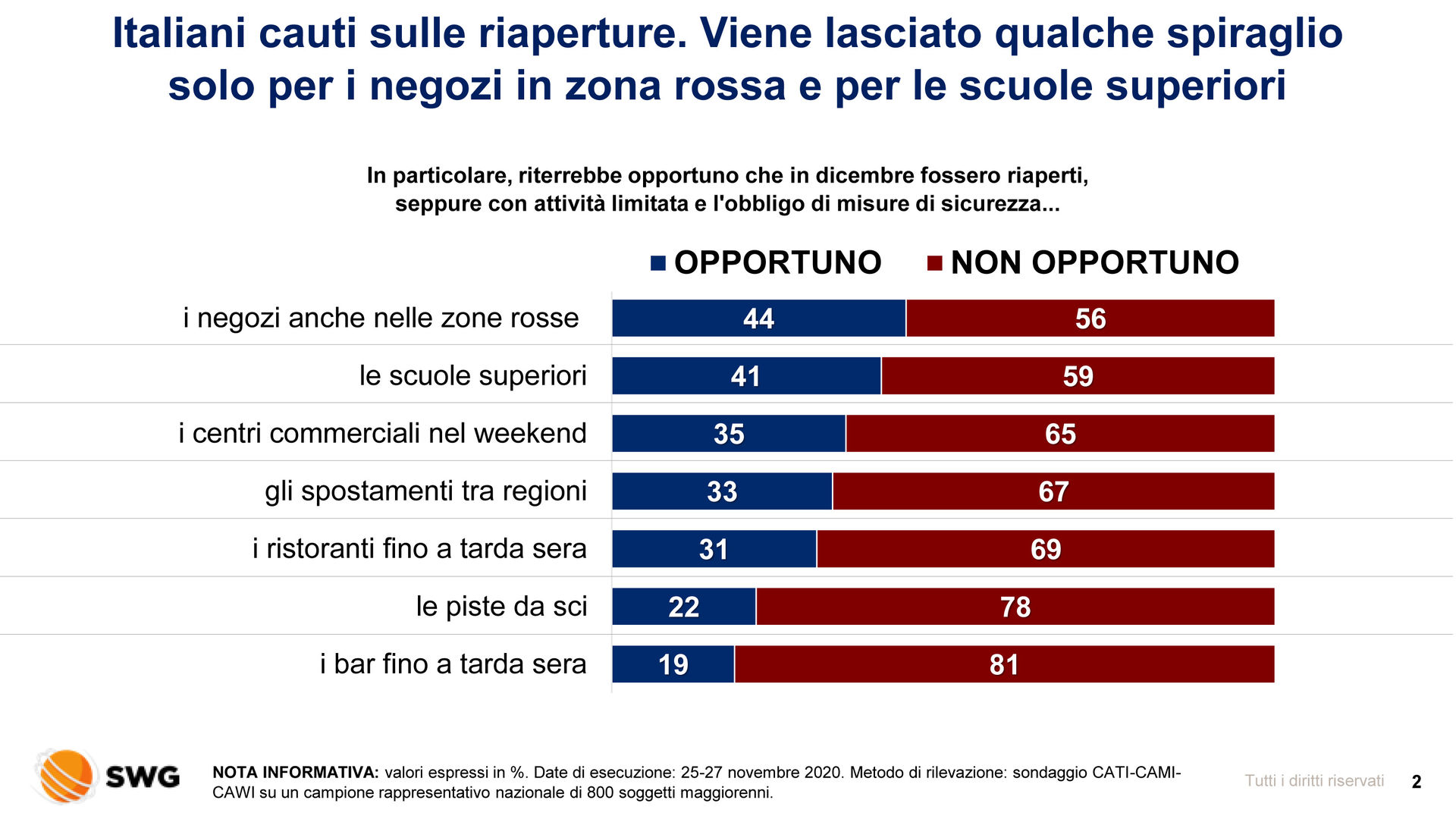 Il “no” è meno inflessibile per gli over 64 e per quanto riguarda l’apertura dei negozi in zona rossa e delle scuole. Ma su ristoranti, impianti sciistici e spostamenti tra regioni, la risposta è chiara. Siamo ancora molto preoccupati e preferiamo stare al sicuro in casa nostra.