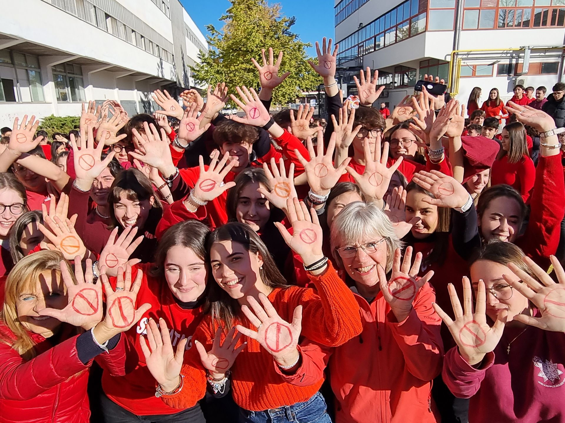 L’evento si è tenuto nel piazzale antistante il Liceo e ha visto la partecipazione di circa 150 studenti, per l’occasione vestiti di rosso, coordinati dai loro docenti e dalla dirigente scolastica Lorenza Prati.