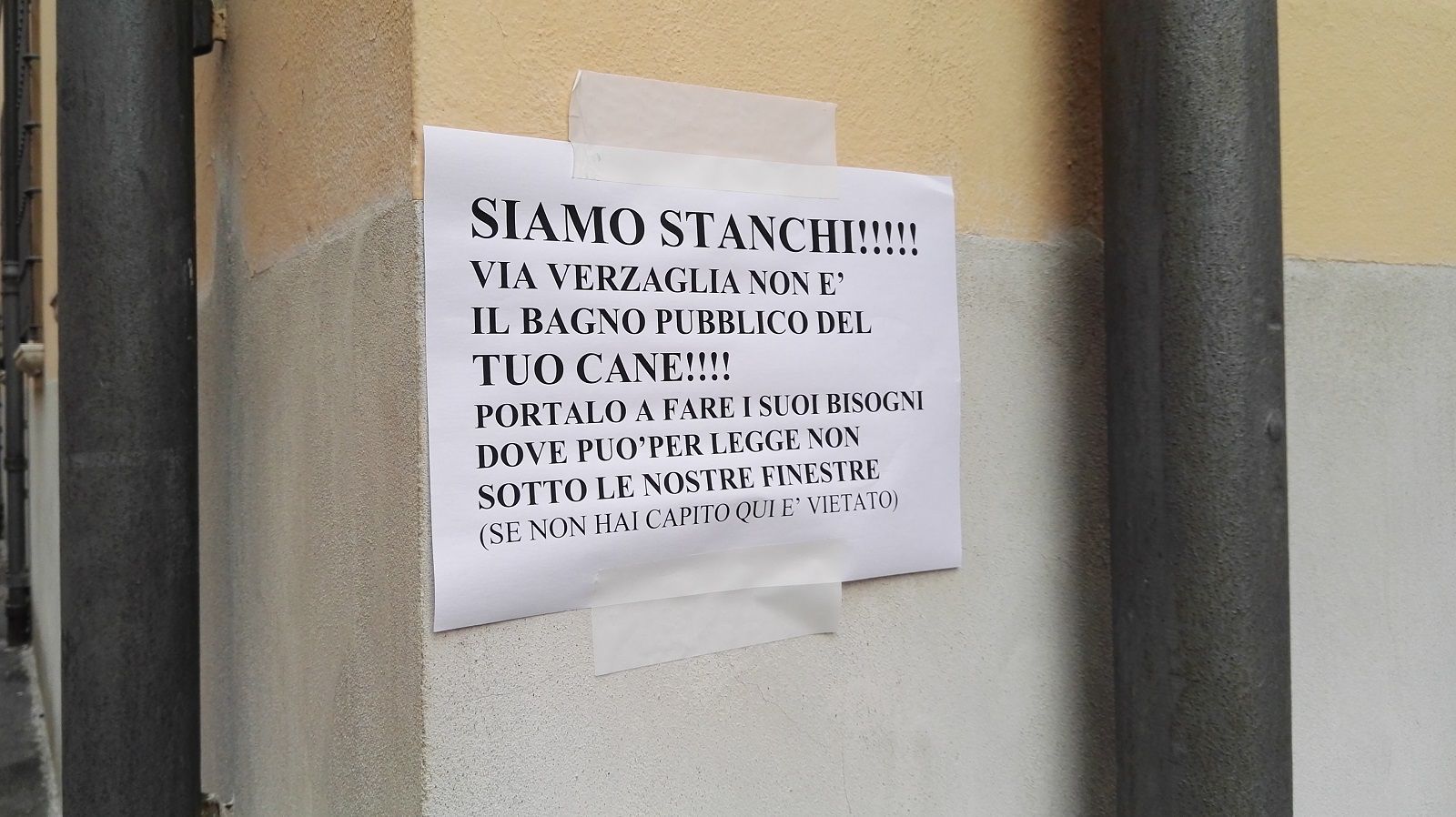 I cittadini di via Verzaglia non ne possono più dei cani e affiggono un cartello molto chiaro: “Siamo stanchi”
