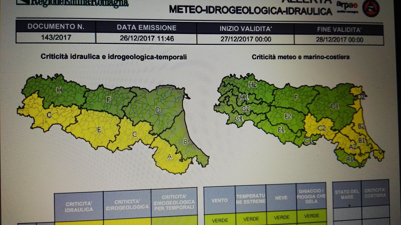 Allerta meteo (giallo) per la giornata odierna. Pioggia anche in Romagna e possibile neve in montagna