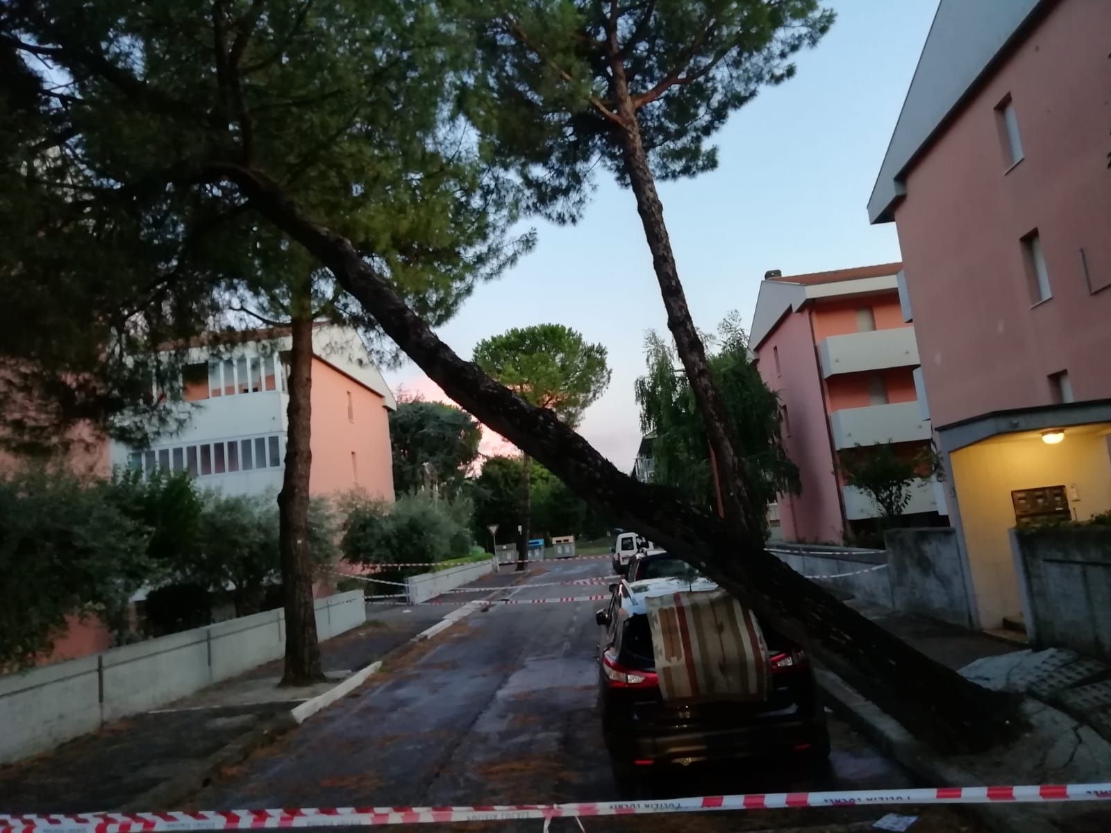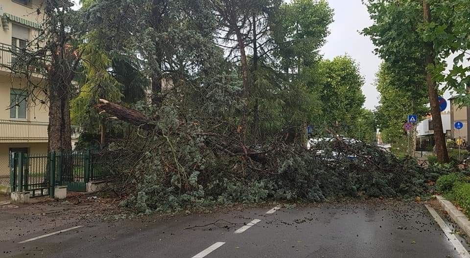 Qui sotto un grosso pino è stato sferzato dal vento e dovrà essere abbattuto vista la sua inclinazione che ha costretto alla chiusura temporanea della via don Sturzo in zona Ponte Abbadesse