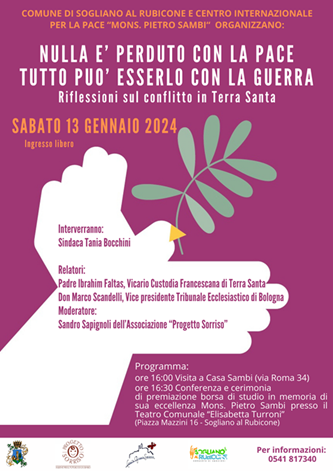 Sabato 13 gennaio a Sogliano al Rubicone si terrà la conferenza “Nulla è perduto con la Pace, tutto può esserlo con la Guerra. Riflessioni sul conflitto in Terra Santa”, frutto della collaborazione tra il Comune e il Centro internazionale per la pace “Monsignor Pietro Sambi”.
