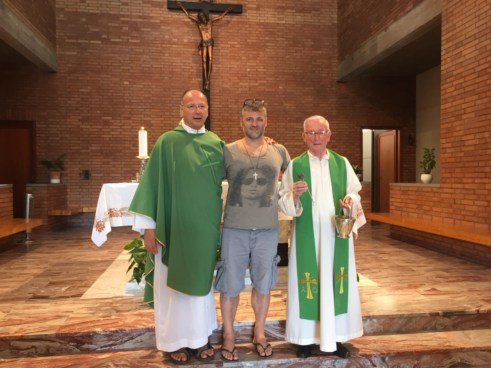 Nella foto qui sotto Pieri è con don Marcello Palazzi, parroco di Case Finali, e don Gilberto Gasperoni, per ricevere una benedizione prima della partenza.