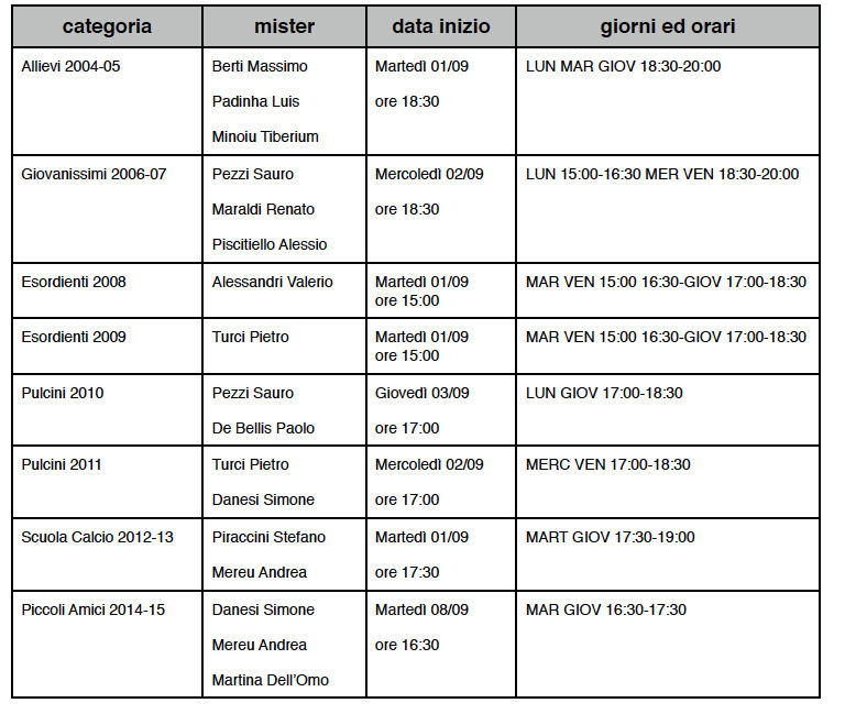 Da martedì 1° settembre tutti in campo secondo lo schema allegato.