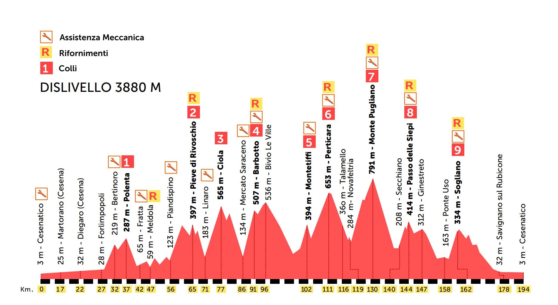 La nuova veste del percorso cosiddetto “lungo” (9 Colli) prevede un totale di 194 chilometri con un dislivello di 3.880 metri. Buona parte della strada che percorreranno i partecipanti sarà quella tradizionale ma con novità sul finale di gara. La prima è dopo la salita del Barbotto con la “nuova” discesa alle Ville di Montetiffi che porterà gli atleti al cospetto di un gruppo di case immerse nel verde, da dove si può scorgere in lontananza l’Abbazia benedettina allo scollinamento della rampa di Montetiffi per poi raggiungere Perticara. La novità più sostanziale arriva però all’ultimo colle che non sarà più il Gorolo, sostituito dalla salita di Sogliano e della conseguente discesa della Cioca: 4 chilometri di fatica con tratti di salita al 10 per cento e poi giù per la Cioca con 18 tornanti in una delle discese più belle della Romagna. Anche il finale vedrà modifiche sostanziali per migliorare la viabilità verso Cesenatico in vista del traguardo. La carovana dei corridori scenderà a valle in direzione Fiumicino evitando la forzata chiusura del casello “Valle del Rubicone” e seguendo lo storico fiume fino alle porte di Cesenatico. Questo renderà la gestione dell’organizzazione più agevole, diminuendo i disagi e aumentando la sicurezza dei partecipanti.