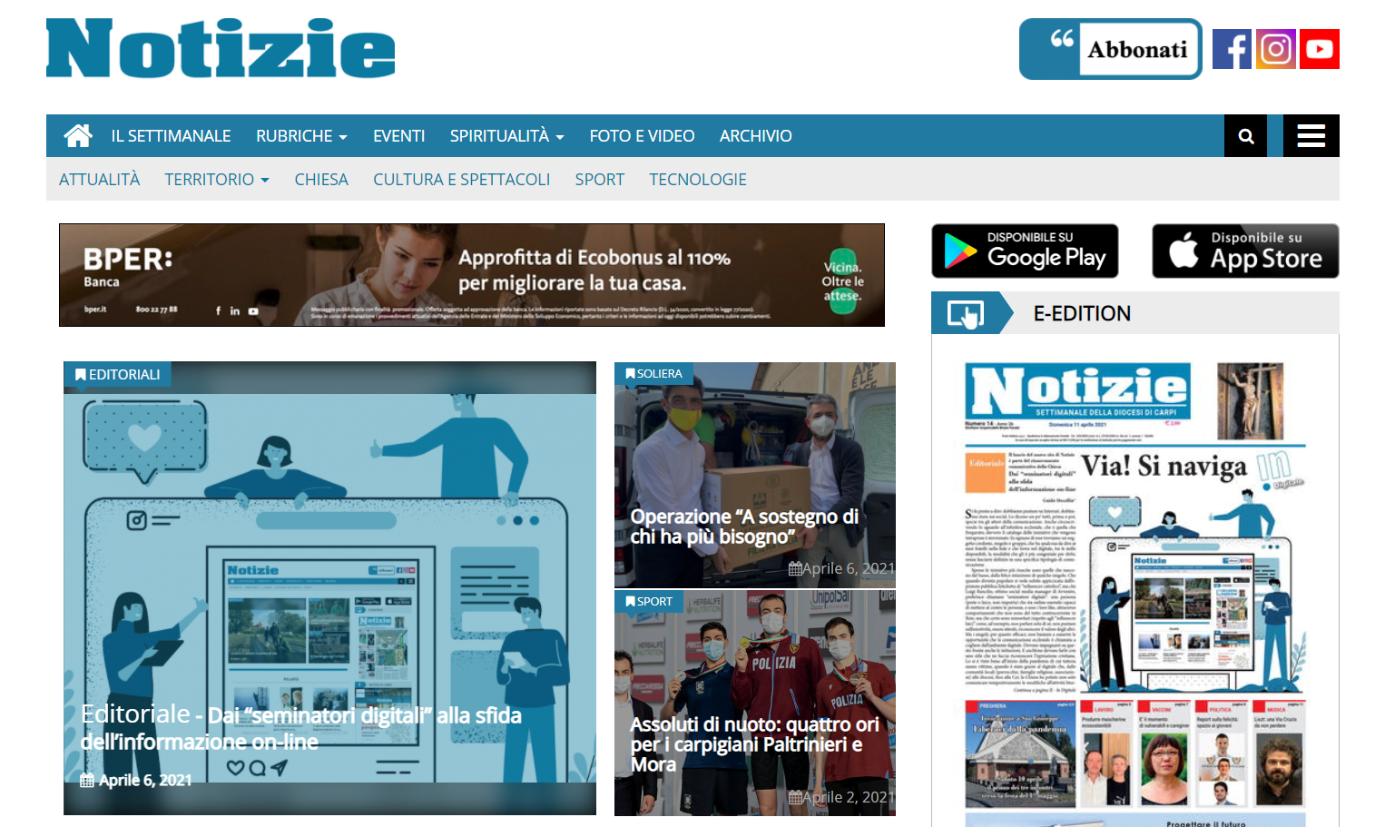 Accanto agli strumenti istituzionali come il sito diocesicarpi.it, alla pagina Fb @diocesidicarpi, all’Ufficio Stampa con il suo canale Telegram, trova spazio la crescita multimediale del settimanale Notizie che alla versione cartacea, abbina una versione digitale di elevata qualità e interattività, pagine social FB e Instagram, canale YouTube per la trasmissione di video ed ora, appunto, il nuovo sito notiziecarpi.it.
