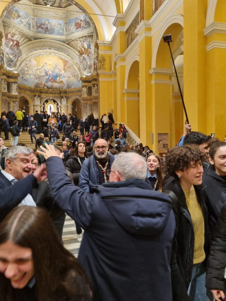 Ho fatto questa scelta anche quando il Signore mi ha chiamato a Matera-Irsina. Ci tengo particolarmente ai giovani. Voi non siete il futuro, ma, come dice papa Francesco, voi siete l’oggi di Dio, l’oggi della Chiesa, l’oggi del mondo. Ho visto prima una mamma, la cui unica figlia di 15 anni, qualche mese fa, ha deciso di mettere fine alla sua vita. Voi giovani siete fragili. Le pianticelle hanno bisogno di essere sostenute da un paletto. Voi giovani avete bisogno di punti di riferimento. La giovinezza non si vede dagli anni, ma dalla capacità di amare la vita. Anche Francesco Gabbani canta che la vita è bella. Ci crediamo davvero? La vita è un dono prezioso, come voi. Non arrendetevi mai di fronte alle prove e alle sconfitte della vita. Questa mamma di cui vi parlavo ha creato un’associazione e ora va nelle scuole a parlare della sacralità della vita. Non permettete a nessuno di rubarvi quello che siete. Una sera ho visto una coppietta che si abbracciava, ma con il cellulare in mano e, mentre stavano abbracciati, chattavano con altri, tutti e due. Così non si comunica. Non vendetevi a questo stile di vita. Questi “aggeggi” non fanno il vostro interesse. L’unico mio interesse è il vostro bene.
