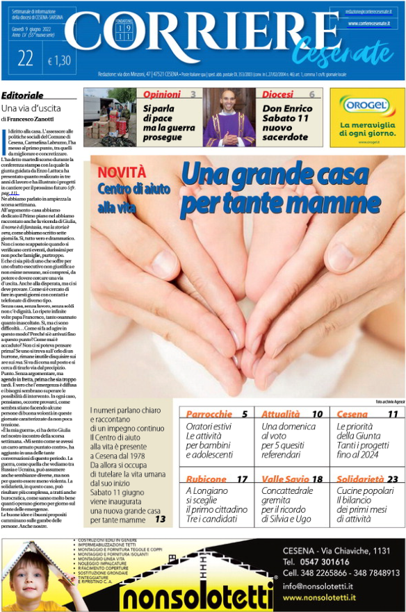 È in edicola da questa mattina il n. 22 del Corriere Cesenate. Anche questa settimana sono tante le esclusive, a partire dal Primo piano: l’apertura di una nuova sede del Centro di aiuto alla vita