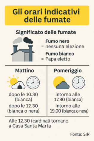 Per quanto riguarda gli orari orientativi delle fumate, quelle mattutine saranno dopo le 10.30 (se la fumata è bianca) e dopo le 12.30. Alle 12.30 è previsto il rientro a Casa Santa Marta per il pranzo, dopo il quale, alle 15.45, i cardinali elettori si avvieranno nuovamente verso il Palazzo apostolico, dove si ritireranno nella Sistina per poi cominciare, al termine dei vespri, le operazioni di voto. Gli orari orientativi delle fumate pomeridiane sono intorno alle 17.30 (se la fumata è bianca) e intorno alle 19.